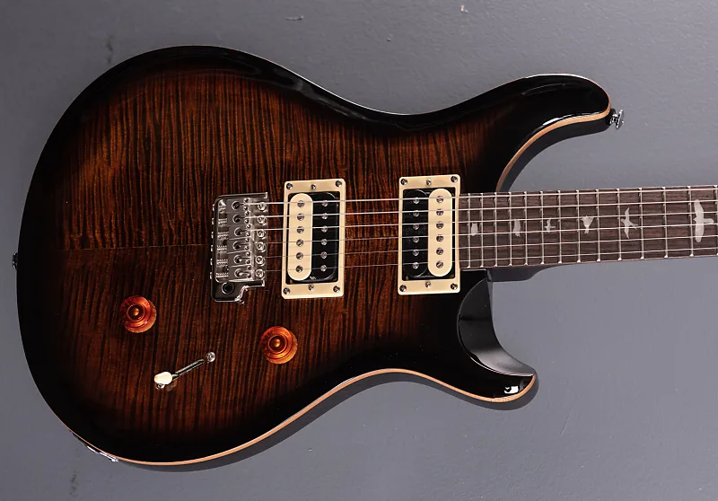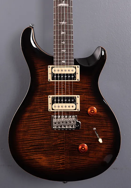 Цвет Black Gold Sunburst, кленовая дека с фаской и шпоном из фламировавшего клена, корпус из красного дерева, широкий/тонкий вырезанный кленовый гриф, накладка из палисандра с радиусом 10" и инкрустацией Birds, мензура 25", ширина порожка 1 11/16", звукосниматели 85/15 «S» для бриджа и грифа, 3-позиционный переключатель с регулятором громкости и функцией push/pull для разделения катушек. контроллеры, фирменный тремоло PRS с запатентованной формовкой и колки разработаны PRS, вес 7,4 фунта, поставляется с защищенным чехлом для гитары PRS Brown.