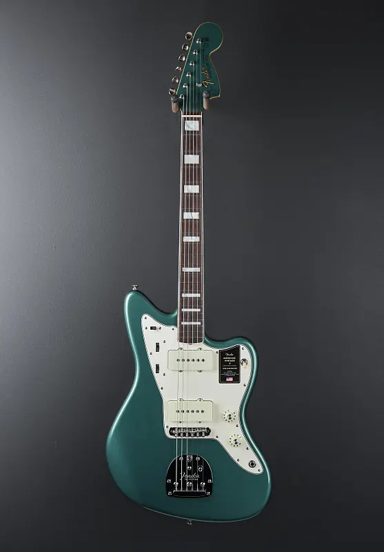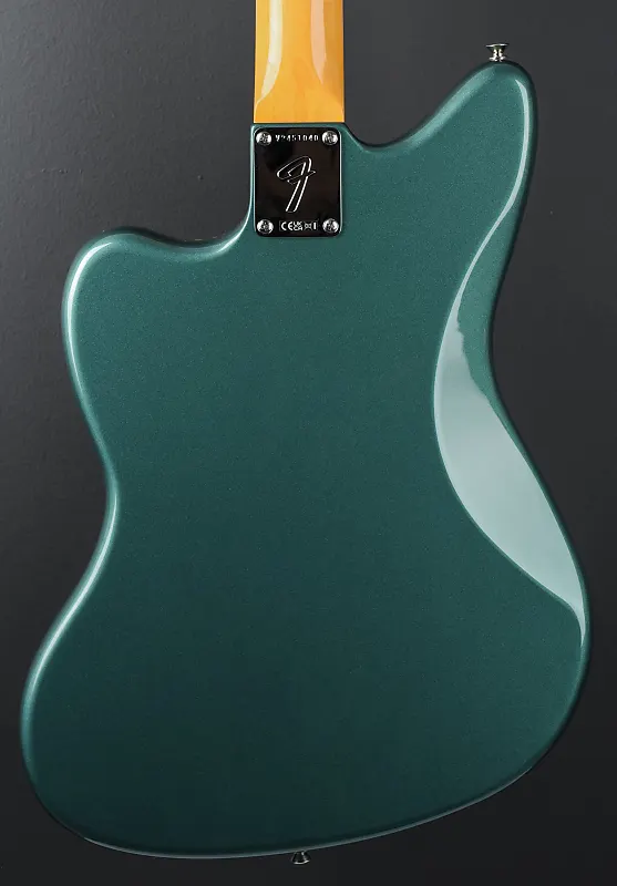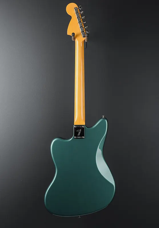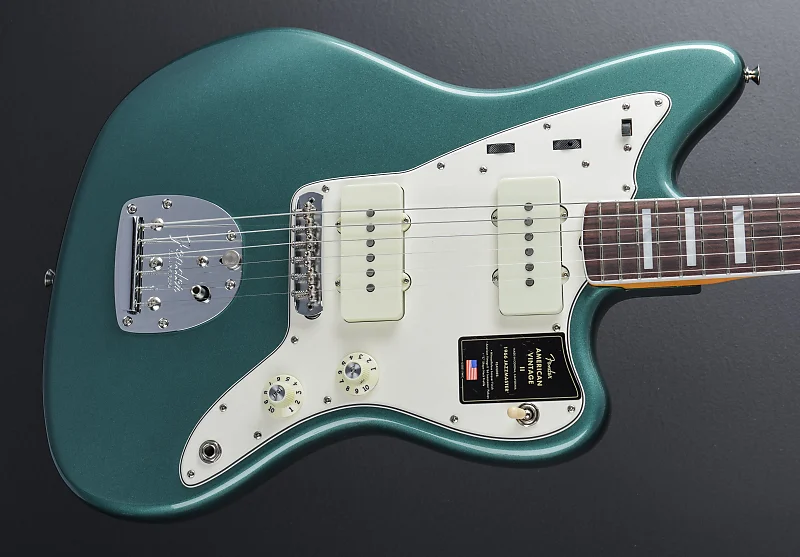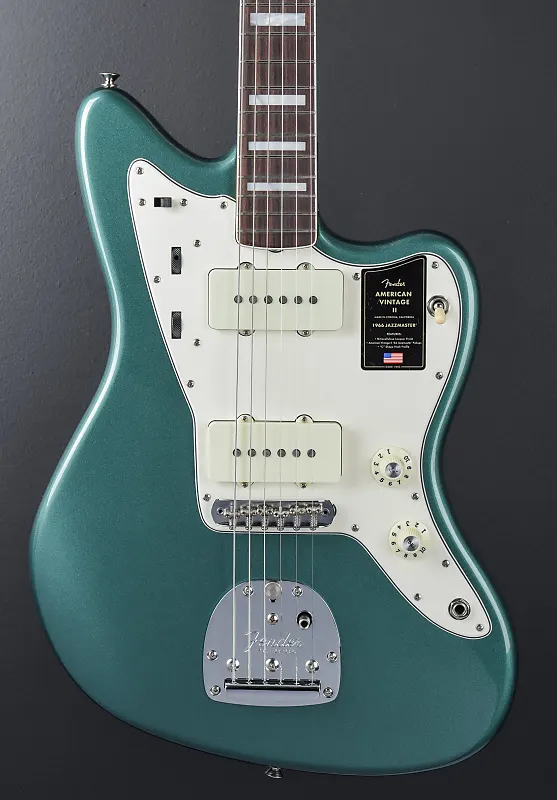 Sherwood Green Metallic с подходящей головкой грифа, корпус из ольхи, лаковое покрытие глянцевым нитроцеллюлозным лаком, C-образная форма 1966 года Гриф из клена, радиус 7,25 дюйма, накладка грифа из многослойного красного дерева с инкрустацией в виде блоков из перлоида и высокими винтажными ладами, длина мензуры 25,5 дюйма, ширина верхнего порожка 1,650 дюйма, сингл-коилы Pure Vintage '66 Jazzmaster, 3-позиционный переключатель с регуляторами громкости и тембра плюс регуляторы цепи лид (ползунок вниз): общий громкость, общий тембр; регуляторы цепи ритма (ползунок вверх): два колесика для регулировки громкости и тембра верхнего звукоснимателя, мост Pure Vintage Jazzmaster с резьбовыми стальными седлами, плавающий тремоло Pure Vintage с кнопкой блокировки и нажимной ручкой тремоло, тюнеры Pure Vintage одного ряда Fender deluxe, вес 8,2 фунта, в жестком кейсе