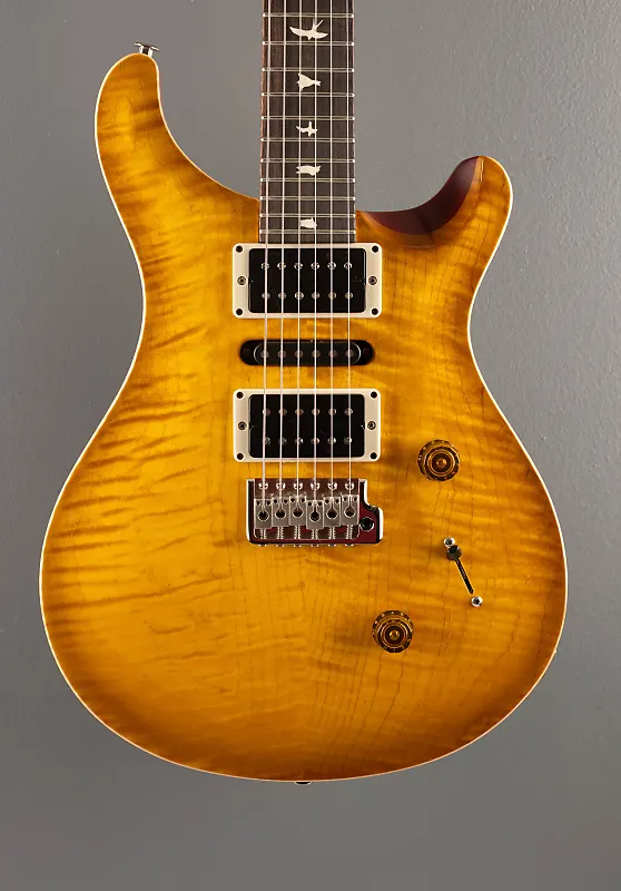 McCarty Sunburst, глянцевое нитро покрытие корпуса, резной фигурный топ из клена со скрипкой, корпус из красного дерева, тонкий резной гриф из атласного нитро, палисандровый гриф радиусом 10 дюймов с олдскульными вставками Bird, длина мензуры 25 дюймов, 1 порожок 11/16 дюйма, бридж и нековые звукосниматели PRS 85/15, а также средний звукосниматель NS-01, 5-позиционное переключение лезвий с регуляторами громкости и тембра push/pull катушки, Запатентованное PRS тремоло, блокировка тюнеров PRS Phase III с кнопками крыла, 7,7 фунта, с чехлом