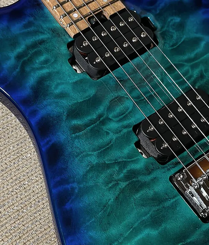 Сочетая утонченный стиль с выразительным звучанием, DK24 HH 2PT CM QM также предлагает премиальные современные функции, такие как пятирежимный переключатель звукоснимателей, ручки в стиле Stratocaster для громкости (с потенциометром низкого трения EVH Bourns на 500K) и регуляторы тона без нагрузки, тремоло-мост Gotoh Custom 510, блокирующие колки, хромированная фурнитура и многое другое.