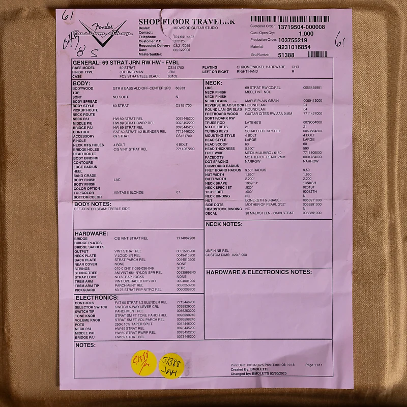 Fender Custom Shop 1969 Stratocaster Journeyman Relic в цвете Vintage Blonde сочетает в себе неподвластный времени стиль с ощущением любимого инструмента. Его легкая выдержка предлагает характер десятилетий игры без сильного износа, в то время как винтажная сборка отражает суть золотой эры в истории электрогитары. От гладкой, округленной шеи до звучащего корпуса, он приглашает к непринужденному самовыражению и связи с музыкой, которая вдохновляла поколения.