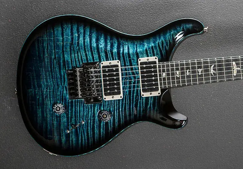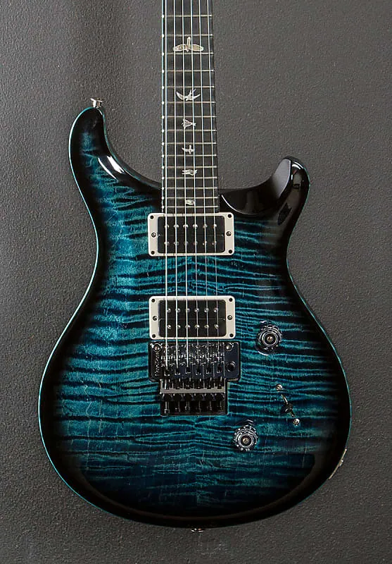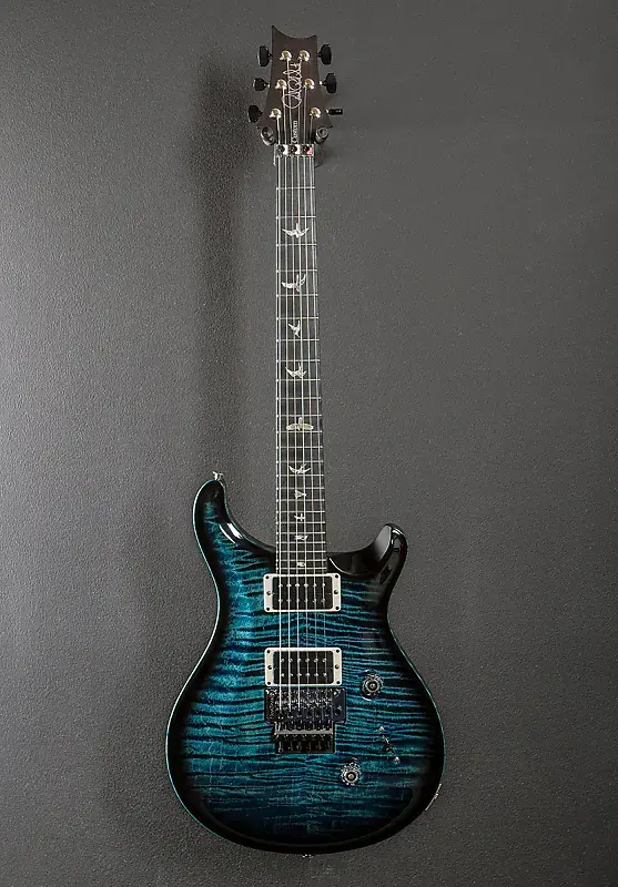 Cobalt Smokeburst, высокоглянцевое нитро-покрытие, вырезанный под скрипку топ из клена Flame Maple 10, корпус из махагона, шея с Pattern Thin из клена, накладка из эбони радиусом 10 дюймов с инкрустацией Bird, масштаб 25 дюймов, ширина верхнего порожка 1 11/16 дюйма, металлические звукосниматели PRS на бридже и грифе, 5-позиционный переключатель с регуляторами громкости и тона. Оригинальный тремоло с блокировкой Floyd Rose, колки PRS Phase III без блокировки с крыльчатыми кнопками, вес 8,0 фунтов, с жестким футляром