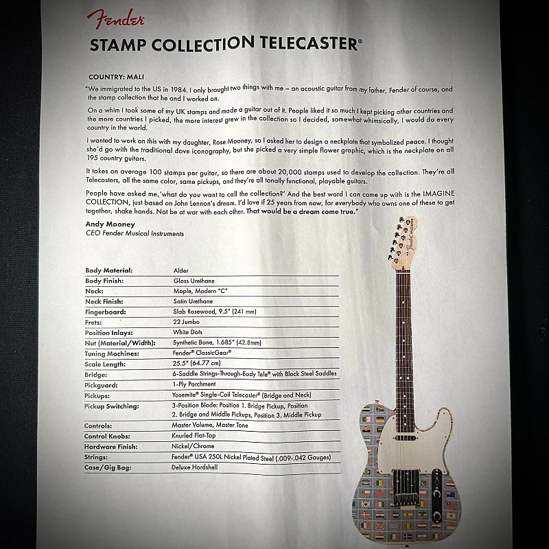 В среднем на одну гитару требуется около 100 марок, так что для разработки коллекции использовано около 20 000 марок. Все они Telecaster, одного цвета, со смичными звукоснимателями, и у всех одинаковое звучание.