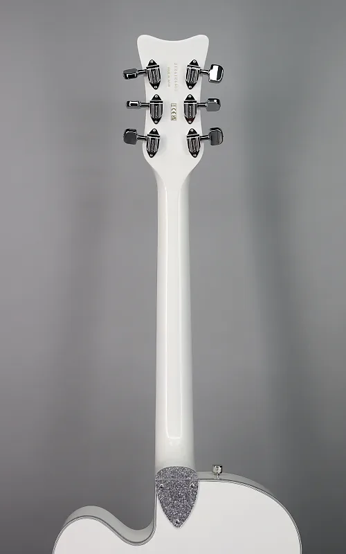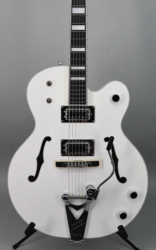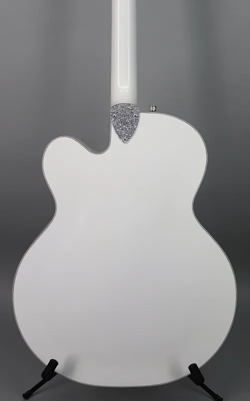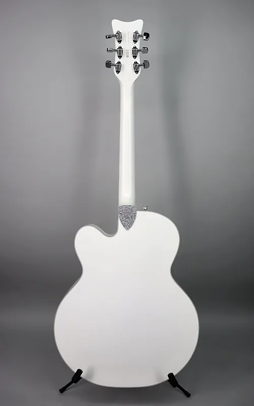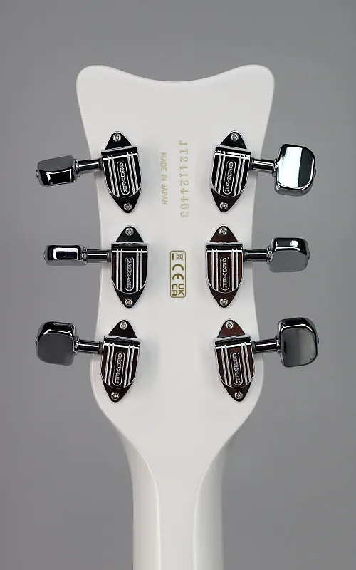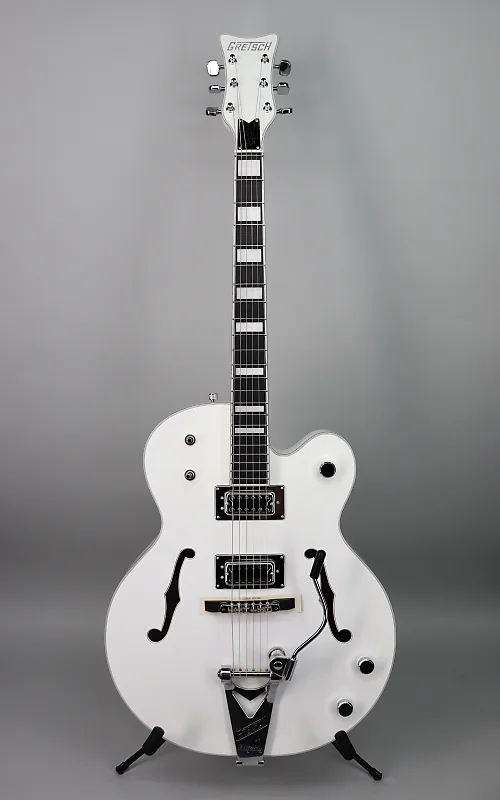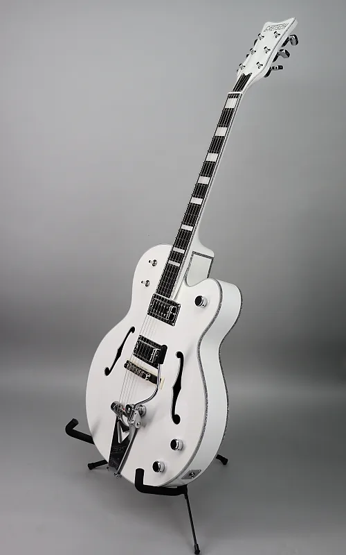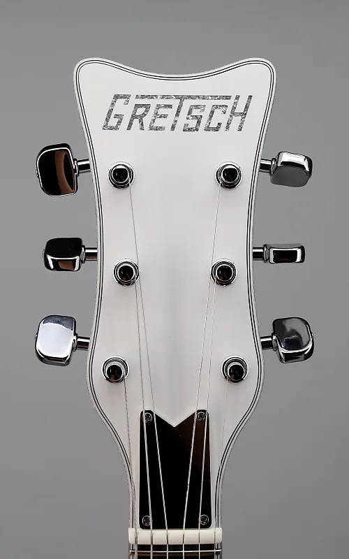 Характеристики: Корпус из ламинированного клена с изогнутой верхней и задней панелями; ширина корпуса 17"; глубина корпуса 2,75"; гриф из трех частей (клен/орех/клен); мензура 25,5"; накладка грифа из эбенового дерева; радиус накладки грифа 12"; 22 средне-джамбо лада (плюс нулевой лад); кость на нуле 1,71"; мост Adjusto-Matic с эбеновой основой с фиксатором; ручки управления Gretsch G-arrow; никелированная фурнитура; белый глянцевый лак из нитроцеллюлозы.