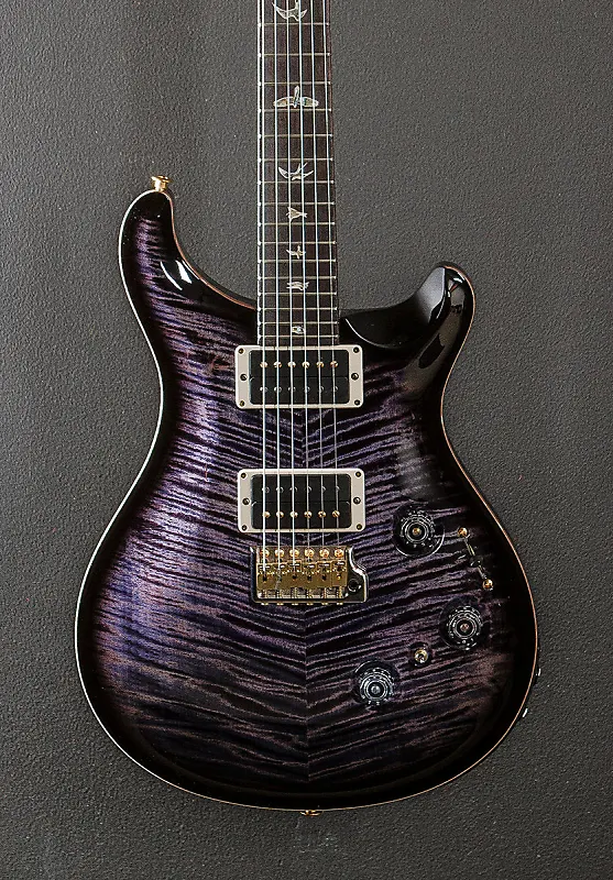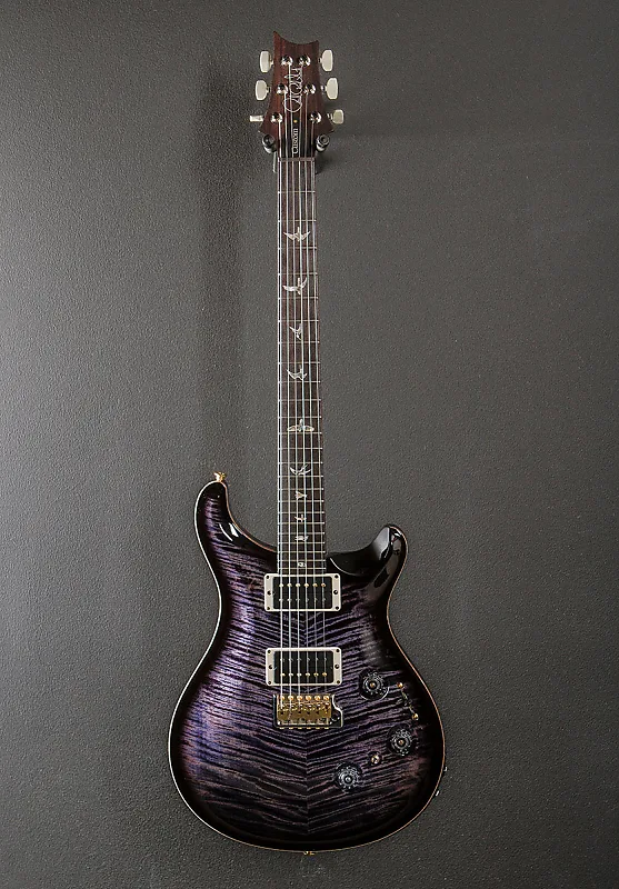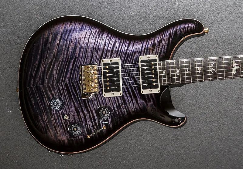 Purple Mist, глянцевое финишное покрытие нитроцеллюлоза, верх из кленовой древесины с резным рисунком Flame Maple 10, корпус из красного дерева, гриф из тонко резного красного дерева Pattern Thin, накладка из розового дерева с радиусом 10″ и инкрустацией Bird, длина мензуры 25″, ширина струнодержателя 1 11/16″, звукосниматели Bridge и Neck 85/15 плюс система PRS/L.R. Baggs piezo, 5-позиционный переключатель с контролем громкости и тона, а также 3-позиционный селектор и регулятор смешивания для пиезо-системы, фирменный пьезо-тремоло PRS Gen III, блокирующие колки PRS Phase III с кнопками крыльями, вес 8.0 фунтов, в жестком кейсе