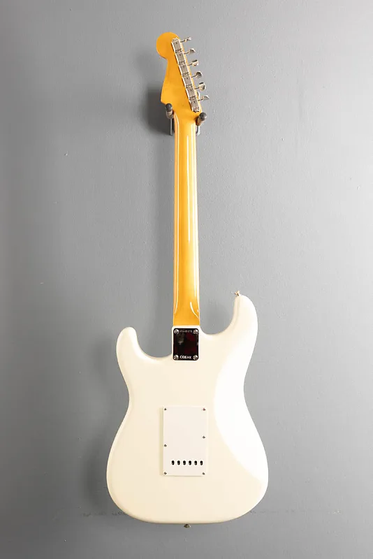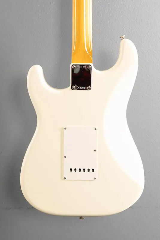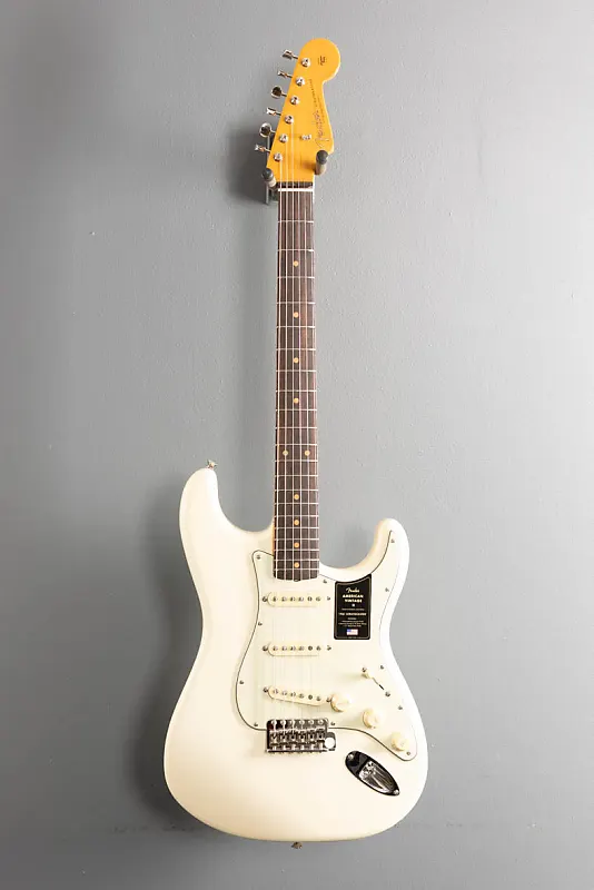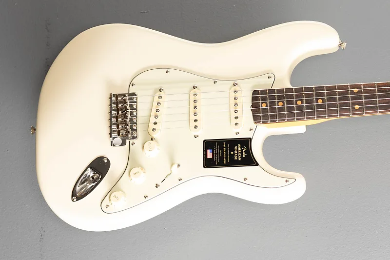 Цвет Olympic White, корпус из ольхи, покрытие глянцевым нитроцеллюлозным лаком, гриф из клена формы C 1961 года с радиусом 7.25" и накладкой из розового дерева с винтажными высокими ладьями, длина мензуры 25.5", ширина верхнего порожка 1.650", звукосниматели Pure Vintage '61 single coil для стратокастеров, 5-позиционный переключатель с мастер-громкостью, регулятором тона 1 (гриф/средние звукосниматели) и регулятором тона 2 (бригадные звукосниматели), синхронизированное тремоло Pure Vintage тремоло с изогнутыми стальными седлами, тюнеры Pure Vintage с одной линией от Fender deluxe, 7,8 фунта, с жестким футляром