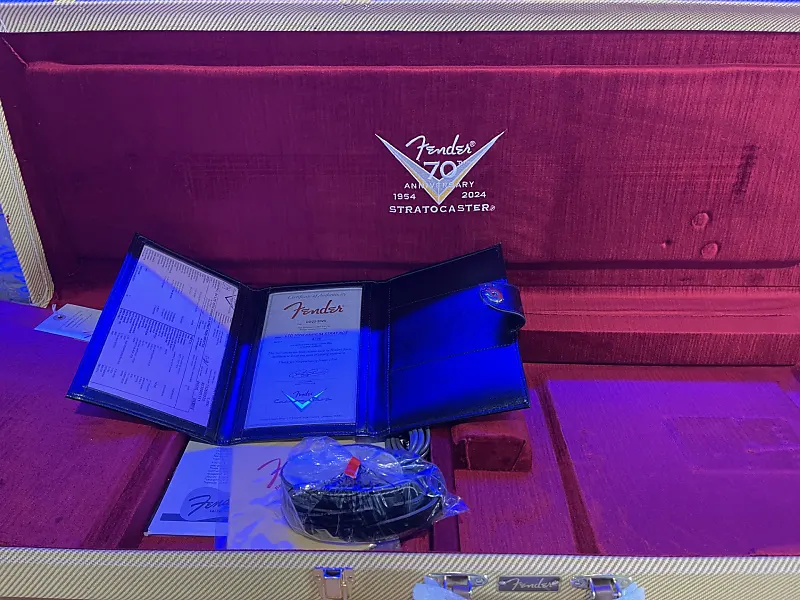 Отделка NOS лаком; корпус из двух частей отборного ясеня с косым швом (с торца высоких струн); гриф из цельной кленовой доски с радиальной распилкой четвертями и формой спинки 7/'54 мягкий «V»; радиус грифа 7,25"-9,5" винтажный составной; 21 лад среднего винтажного типа (47095); новые ручной сборки звукосниматели '54 Strat Custom Shop; проводка в стиле винтаж '54 Strat с конденсатором из вощеной бумаги; 5-позиционный переключатель; однослойный белый защитный и задний щиток (.070 PVA, серийный номер на задней пластине); крышки звукоснимателей и ручки ABS белого цвета в стиле '54 Strat; тремоло Custom Shop Vintage Synchronized; тюнинговые механизмы в винтажном стиле; кость на верхнем порожке 1,625"; струнодержатель-диск; накладка на гриф к 70-летию Strat; роскошный чехол с вышивкой; специальный комплект для кейса; сертификат подлинности.