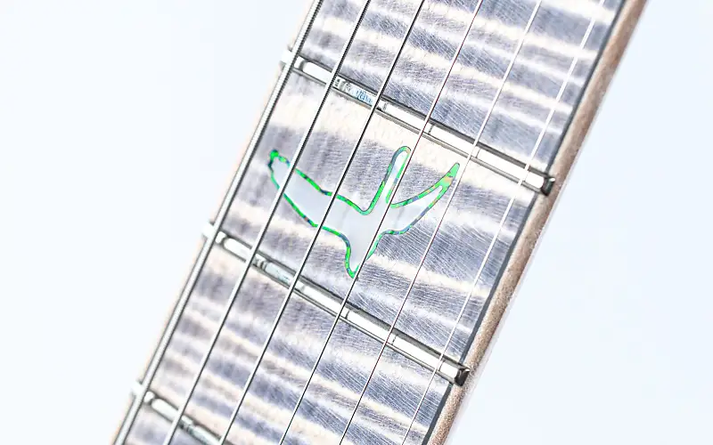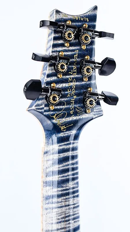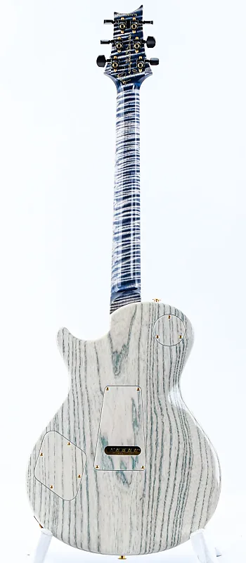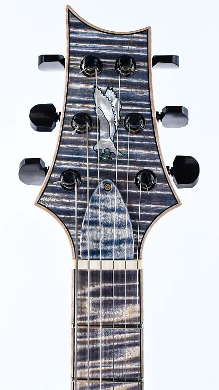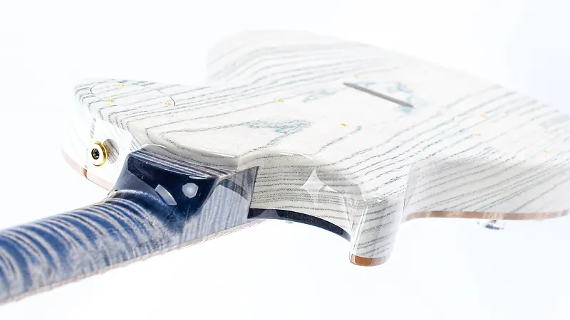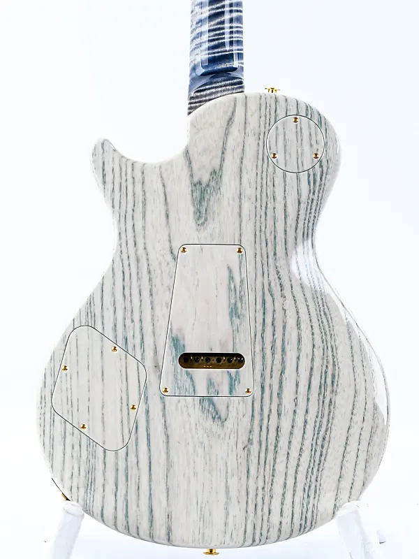 Корпус из древесины болотного ясеня окрашен в белый цвет и украшен потрясающей крышкой из кленового резного шпона, покрытой высокоглянцевым финишем Triple Faded Indigo. Гриф из клена с волнистыми прожилками, также окрашенный в белый цвет, создает яркий контраст с подходящей по цвету накладкой грифа из волнистого клена, украшенной мерцающими инкрустациями-птицами из перламутра.