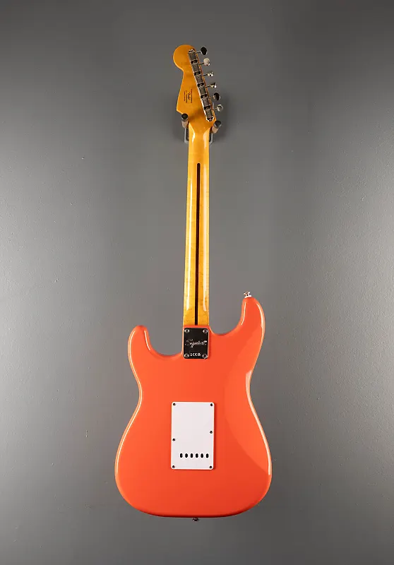 Цвет Fiesta Red, изготовлено в Индонезии, корпус из нятоха, глянцевое полиуретановое покрытие корпуса, гриф из клена с профилем C, накладка из клена радиусом 9,5 дюймов с узкими высокими ладами, мензура 25,5 дюйма, ширина верхнего порожка 1,650 дюйма, звукосниматели Strat с одинарной катушкой Alnico от Fender, 5-позиционный переключатель с мастер-громкостью, регуляторами тембра 1 (гриф/средний звукосниматель) и тембра 2 (бриг-бридж), тремоло в винтажном стиле