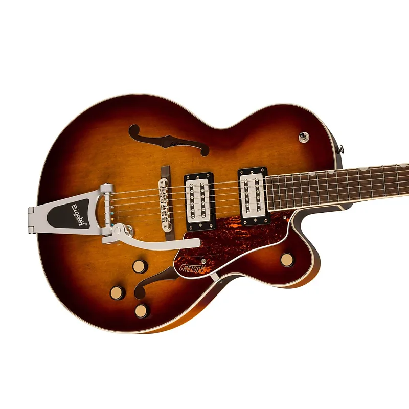G2420T Streamliner Hollow Body Single-Cut с Bigsby оснащена полностью пустотелым арочным телом из клена с параллельными резонансными планками для насыщенного звучания, глубокого резонанса и «звучания с большим телом».