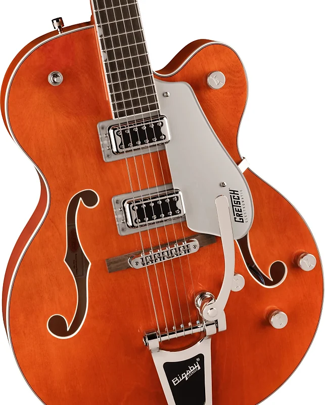 С тремоло Bigsby B60, мостом Adjusto-Matic, серебряной накладкой, никелированной фурнитурой и яркой отделкой Orange Stain, G5420T обладает культовым внешним видом, соответствующим моделям Gretsch 50-х и 60-х годов.