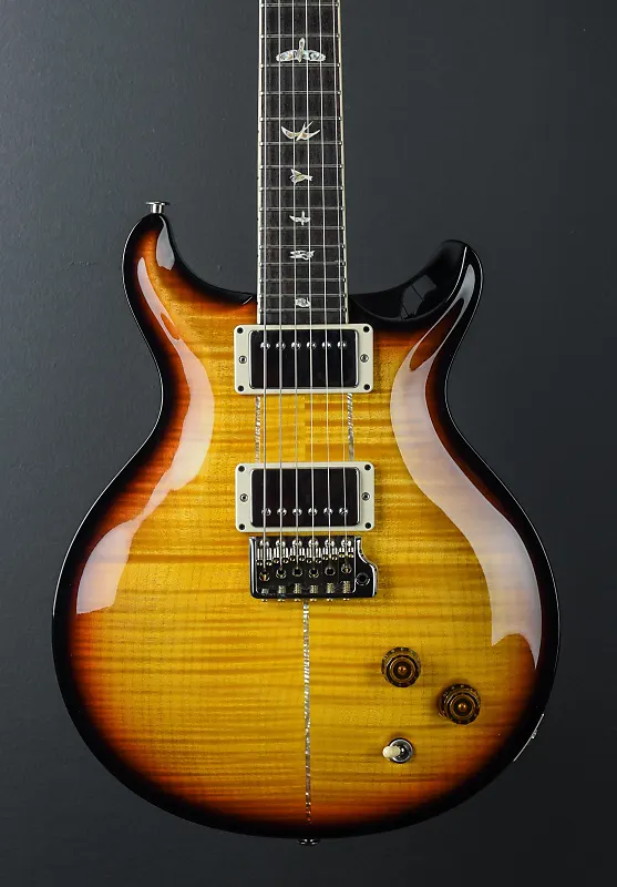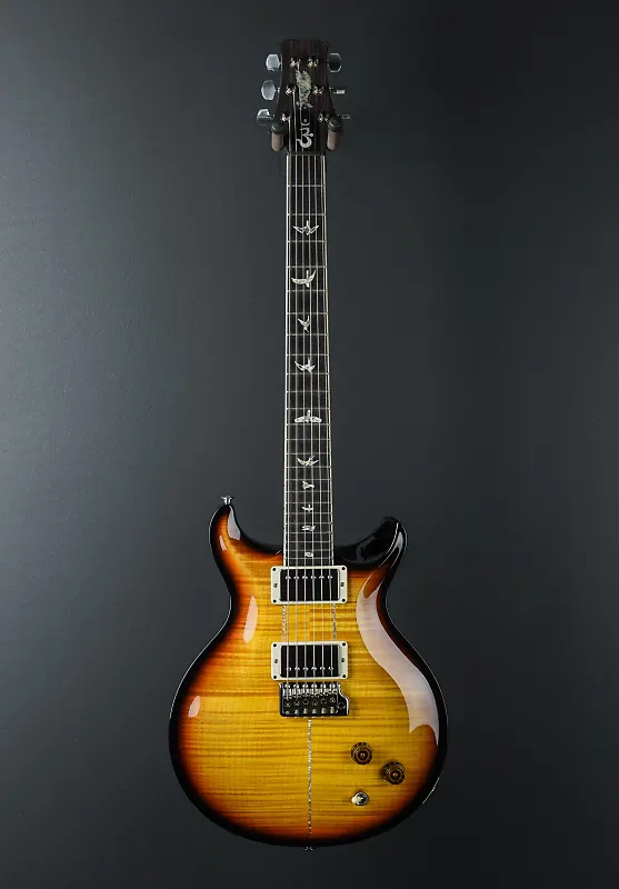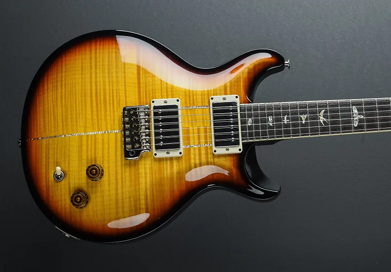 Цвет Vintage Smokeburst, резной топ из клена с фигурной текстурой Violin, корпус из красного дерева, гриф из красного дерева Pattern, грифовая накладка из палисандра радиусом 10″ с инкрустацией в виде птиц, мензура 24,5″, ширина верхнего порожка 1 11/16″, датчики Santana для бриджа и грифа, 3-позиционный переключатель с регуляторами громкости и тона, фирменный PRS тремоло Gen III и PRS Тюнеры Phase III с блокировкой, 7,8 фунтов, с жестким футляром