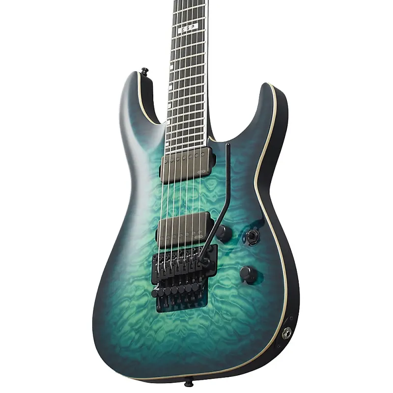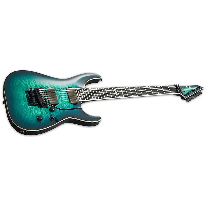 ESP E-II Horizon FR-7 Black Turquoise Burst - это 7-струнная гитара с оригинальным тремоло Floyd Rose, с великолепной верхней декой из клена с рисунком «quilted» и отделкой Black Turquoise Burst с белой окантовкой по корпусу, грифу и головке грифа.