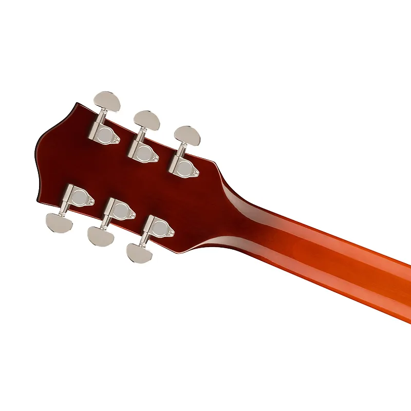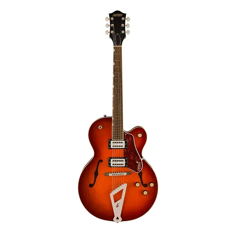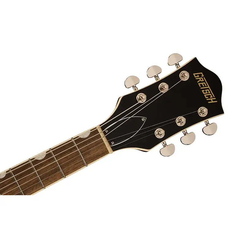 G2420 Streamliner Hollow Body Single-Cut с хвостовиком Chromatic II оснащена полностью полым арочным кленовым корпусом с параллельными резонаторными планками для насыщенного звучания, глубокого резонанса и "большого звучания корпуса".