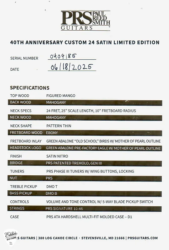 Этот памятный выпуск продолжает круглогодичное празднование 40-летия PRS. Всего будет выпущено только 500 экземпляров этой модели Custom 24 Satin Limited Edition 40th Anniversary. В комплекте прилагается сертификат 40th Anniversary с подписью вручную.