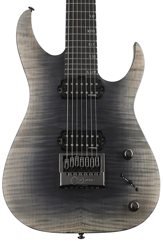 Семиструнная электрогитара с монолитным корпусом из ясеня, верхняя дека из клена, гриф из клена/пурпурного дерева, накладка грифа из эбена и два хамбакера - цвет Fallout Burst.