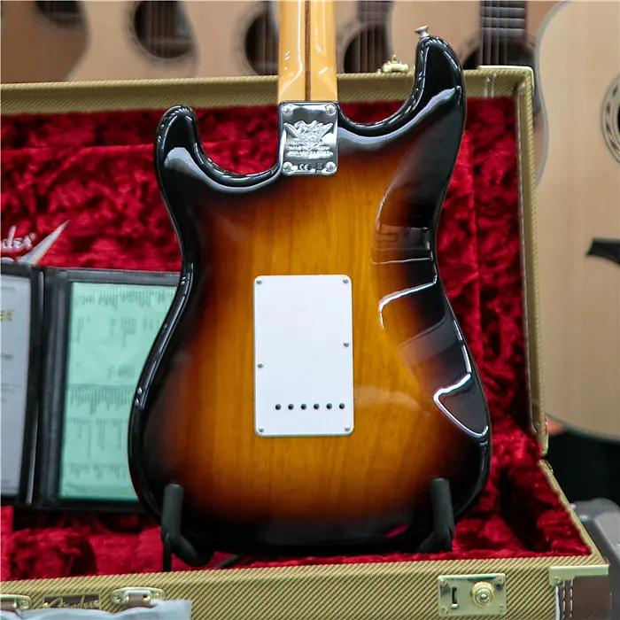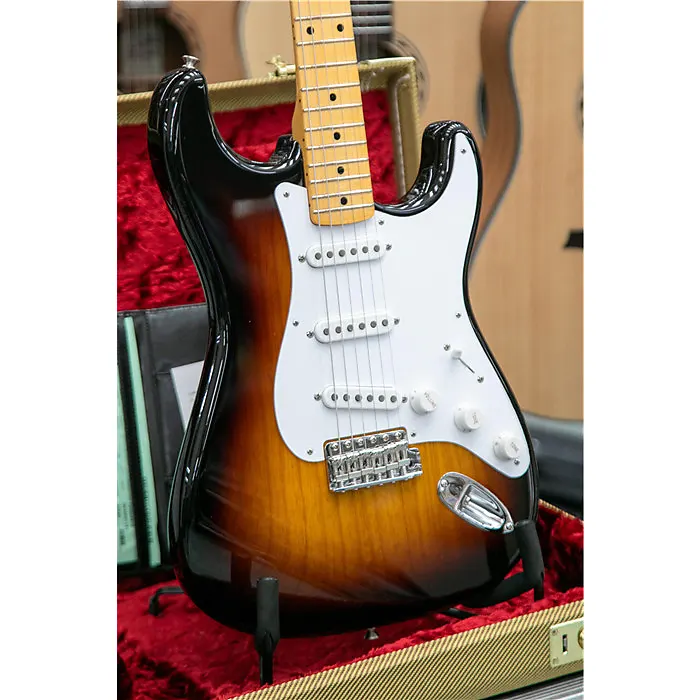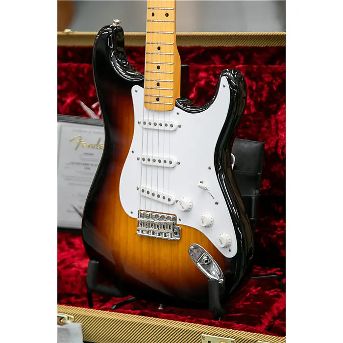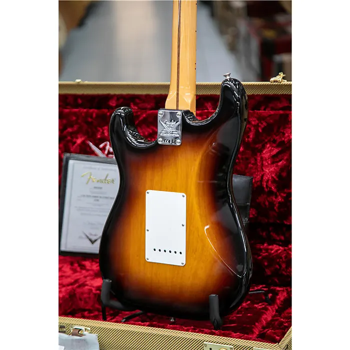Чтобы отпраздновать 70-летие Stratocaster - платиновую годовщину самой великой электрогитары в мире - Fender Custom Shop выпускает ограниченную серию 70th Anniversary 1954 Stratocaster. Ее корпус из двух частей отборного ясеня (с смещенным швом со стороны высоких струн) резонирует сочными верхами, мягким средним диапазоном и плотными низами, а также покрыт великолепным лаком Wide Fade Two-Color Sunburst с различными вариантами обработки Custom Shop с разной степенью износа, включая Time Capsule, NOS, Deluxe Closet Classic, Relic, Journeyman Relic, Heavy Relic и Super Heavy Relic.