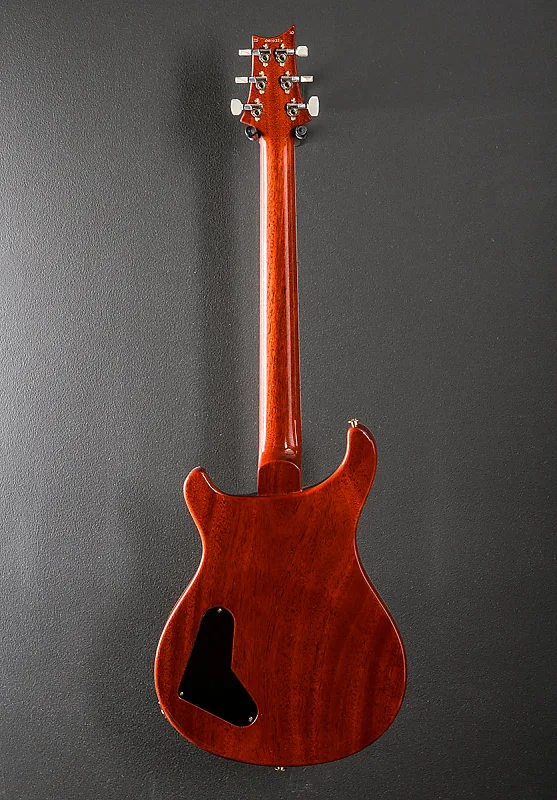 ».McCarty Sunburst, Глянцевое нитро покрытие, Скрипка с резным верхом из клена Flame Maple 10, Корпус из красного дерева, Узор из резного грифа из махагони, Палисандровый гриф радиусом 10 дюймов с инкрустациями Bird и окантовкой из искусственной кости, длина мензуры 25 дюймов, 1 11/16-й порожок, бридж и нековые звукосниматели PRS McCarty III, 3-позиционное тумблерное переключение с регулировкой громкости и регуляторами тембра push/pull катушки, Мост стоптейла PRS с латунными вставками, PRS Phase III невлокирующие колки с крыловидными кнопками, 7,4 фунта, с жестким кейсом