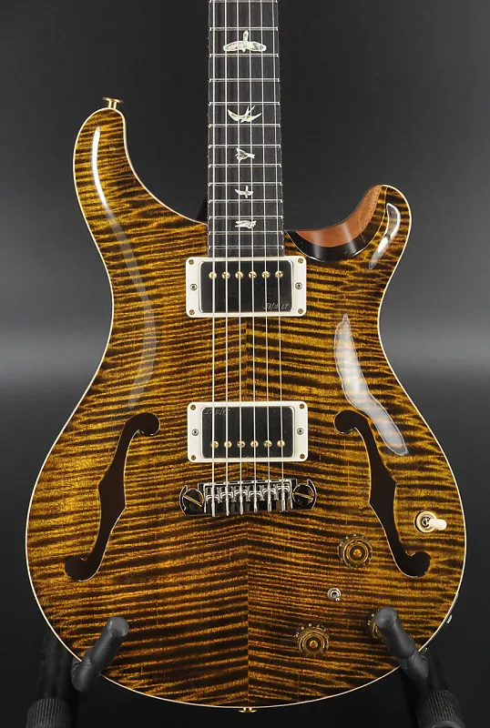 Эта модель Hollowbody II Piezo оснащена великолепной верхней декой из клена с желтой тигровой отделкой и вырезом грифа в стиле Pattern.