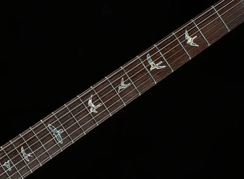 Накладка грифа украшена инкрустациями из перламутра Paua в виде птиц с белой окантовкой, что гармонирует с инкрустацией в виде орла Private Stock на планке головки грифа. Гриф вырезан по профилю Pattern от PRS для комфортной игры, а весь инструмент покрыт глянцевым нитро-лакком, подчеркивающим выразительную текстуру древесины.
