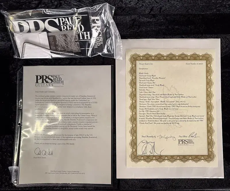 Аппаратное оснащение включает тремоло-мост PRS Gen III и блокирующие тюнеры PRS Phase III, оба в никеле, а также комплект задних крышек из древесины болотного ясеня для легкости и долговечности. Эта гитара поставляется в кожаном футляре Private Stock черного цвета.
