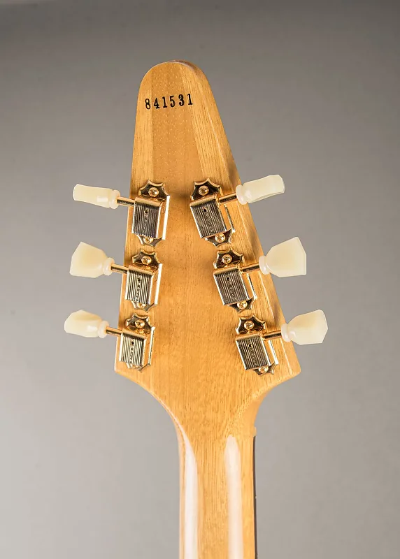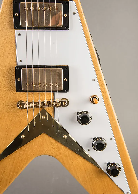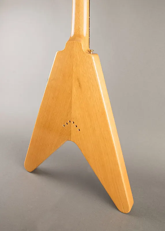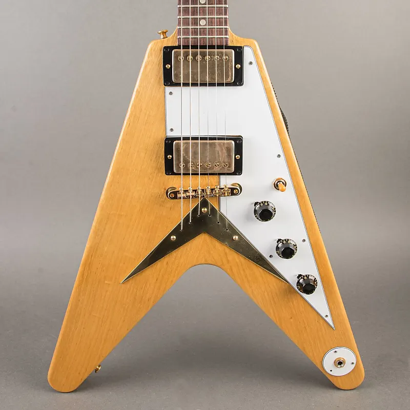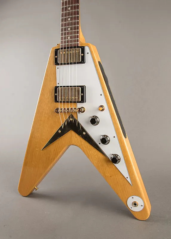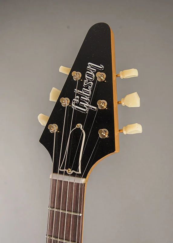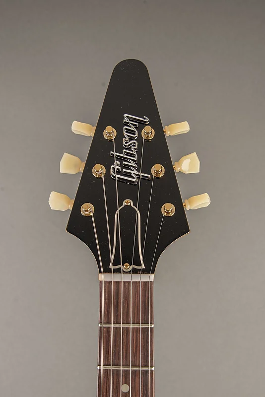 От Gibson: "Gibson Flying V была на несколько шагов впереди своего времени, когда была представлена в 1958 году, и только 81 инструмент был отправлен в тот год, но с тех пор она стала очень популярной. Классические винтажные особенности Flying V были тщательно воссозданы в этой модели Historic Reissue. Модель оснащена бриджем ABR-1 с корпусом из корины с продетыми струнами, звукоснимателями Custombucker, грифом из корины, накладкой из индийского розового дерева, двумя регуляторами громкости и одним регулятором тембра с потенциометрами CTS и конденсатором phone book, золотой фурнитурой, колками Kluson, а также 4-слойной черной накладкой на корпусе. В комплект входит исторически точный чехол с классическим коричневым внешним покрытием и бархатной розовой внутренней отделкой."