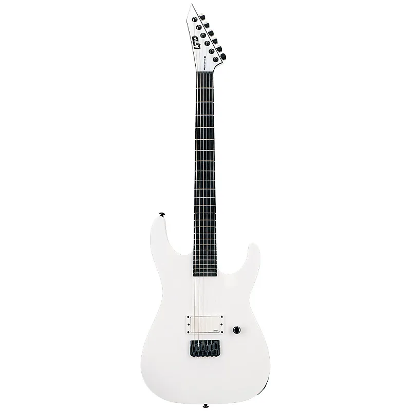 M-HT Arctic Metal/SWS, серия LTD Arctic Metal, масштаб 25,5 дюйма, корпус из ольхи, трехсекционная шейка из клена с конструкцией сквозного грифа, накладка на гриф из эбена Макассар, 24 сверхджамбо ладов из нержавеющей стали, активный хамбакер EMG 81TW у моста с возможностью разделения катушки, мост Hipshot с струнами сквозь корпус, колки LTD с блокировкой, светящиеся маркеры струн на боковой части грифа, черная фурнитура, белый матовый финиш Snow White Satin