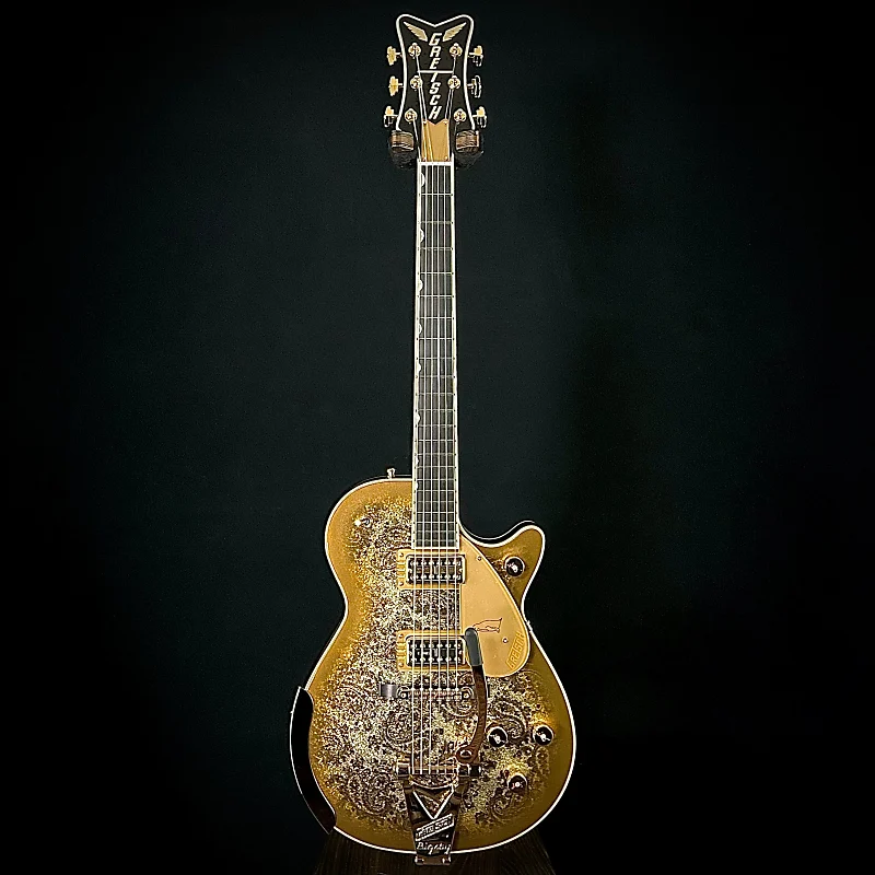 Эксклюзивная модель Paisley Penguin предлагает изящное исполнение классического дизайна Gretsch. Эта модель Penguin оснащена корпусом из полого массива красного дерева с арочным верхом из клена, эстетично украшенным золотым градиентом по краю и золотым узором paisley со сверкающей отделкой сверху. Звукосниматели TV Jones TV Classic и TV Classic Plus Filter’Tron обеспечивают все необходимые для игры яркость, насыщенный тембр и мощность, позволяя инструменту выделяться в миксе и подходить для самых разных музыкальных стилей.