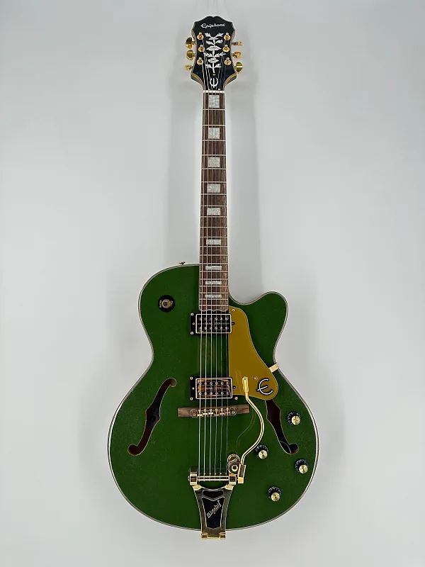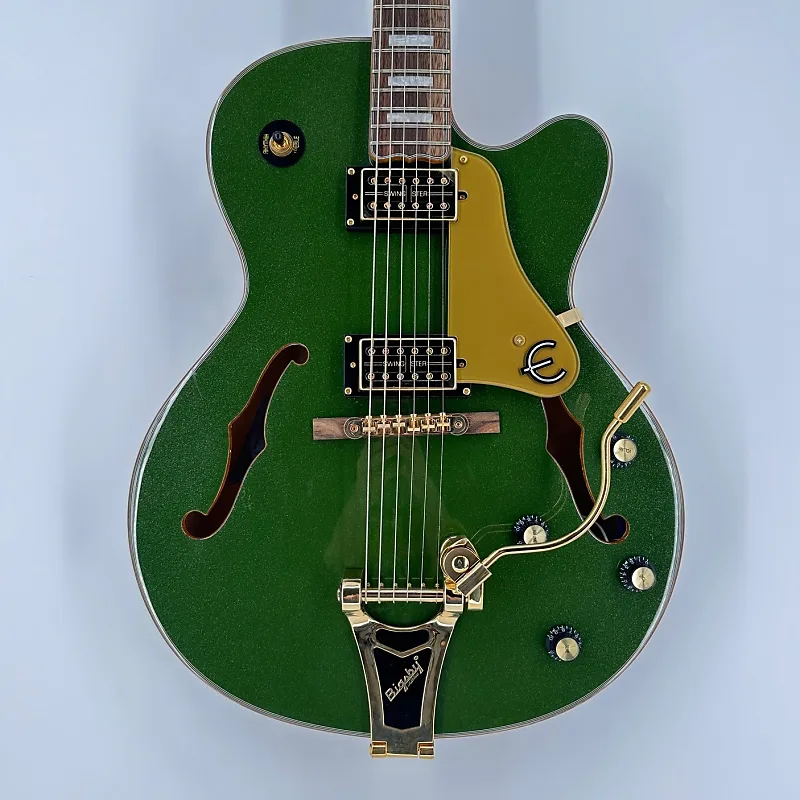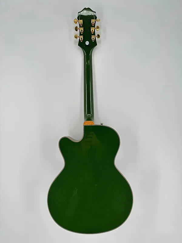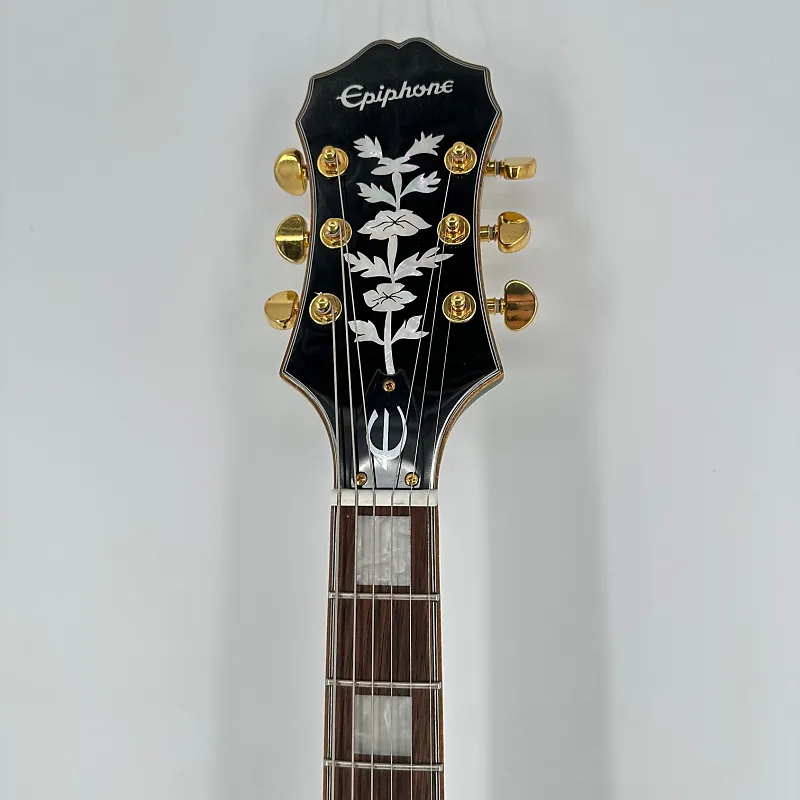 Слоистая верхняя дека из клена, задняя часть и боковые стороны, строй 60-х годов сужающийся C, гриф из индийского лаурела, звукосниматели Epiphone Swingbucker, потенциометры с функцией push/pull для последовательного/параллельного включения.