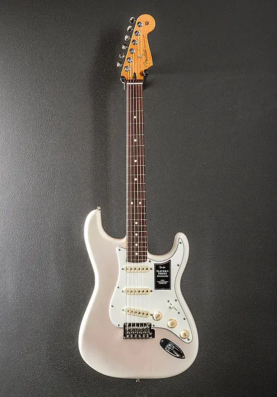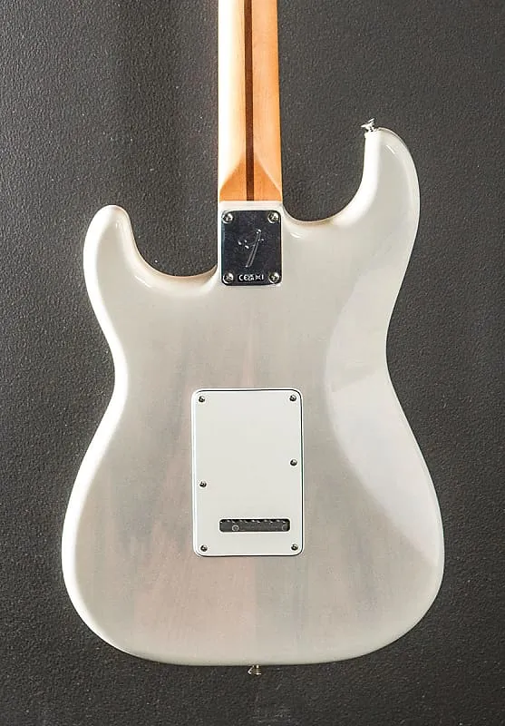 White Blonde, произведено в Мексике, глянцевая полиэфирная отделка корпуса, корпус из камерного ясеня, современная кленовая шейка в форме C с радиусом 9,5 дюймов, гриф из розового дерева с ладыми среднего размера, длина мензуры 25,5 дюймов, ширина порожка 1,650 дюйма, звукосниматели Player Series Alnico 5 типа сингл-котл, 5-позиционный переключатель с главной регулировкой громкости, тоном 1 (для звукоснимателей грифа/среднего) и тоном 2 (для бриджевого звукоснимателя), двухточечный синхронизированный тремоло с кривыми стальными седлами, тюнеры Fender ClassicGear, вес 7,0 фунтов, кейс в комплект не входит