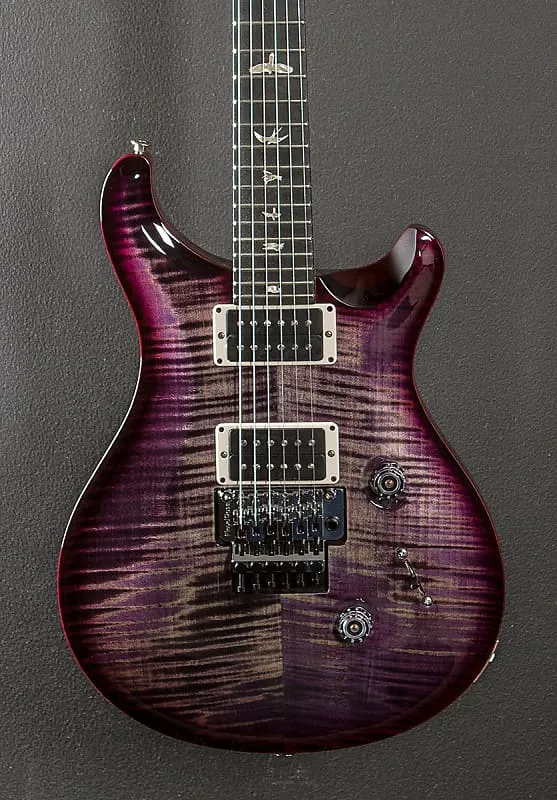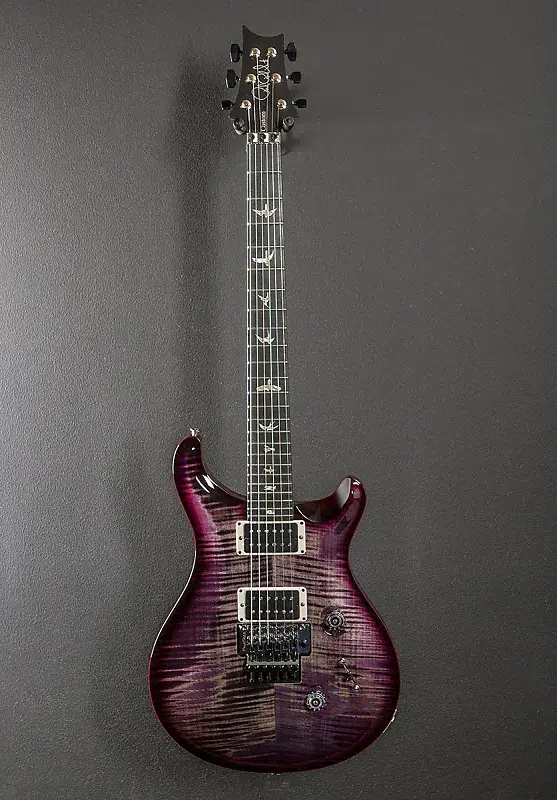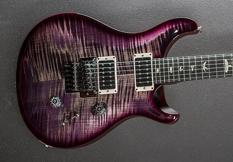 Фиолетовый Wraparound Burst, глянцевое нитро-лак покрытие, верхняя дека из резного клена Flame Maple 10, корпус из махагони, гриф из резного клена Pattern Thin, накладка грифа из эбена радиусом 10" с инкрустацией Bird, мензура 25", ширина порожка 1 11/16", металлические звукосниматели PRS для моста и грифа, 5-позиционный переключатель с регуляторами громкости и тембра