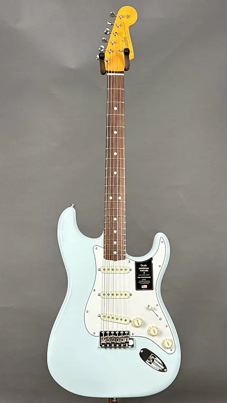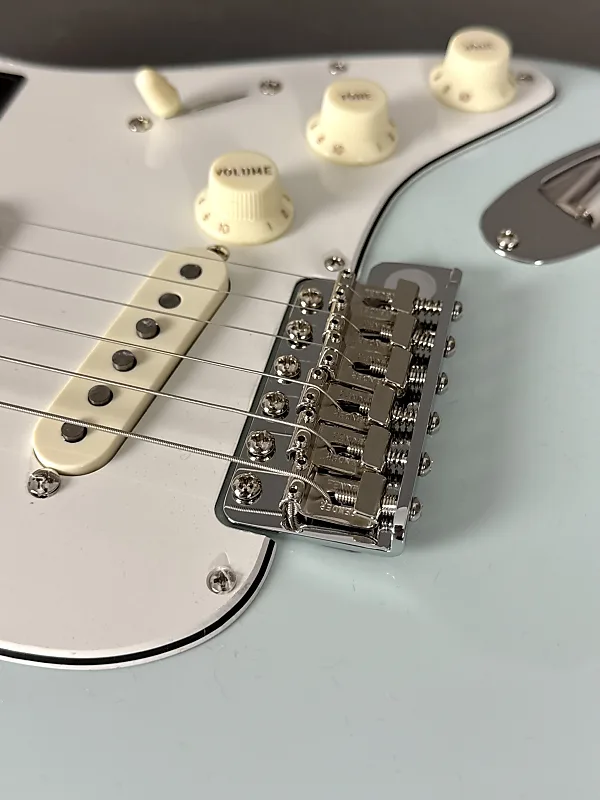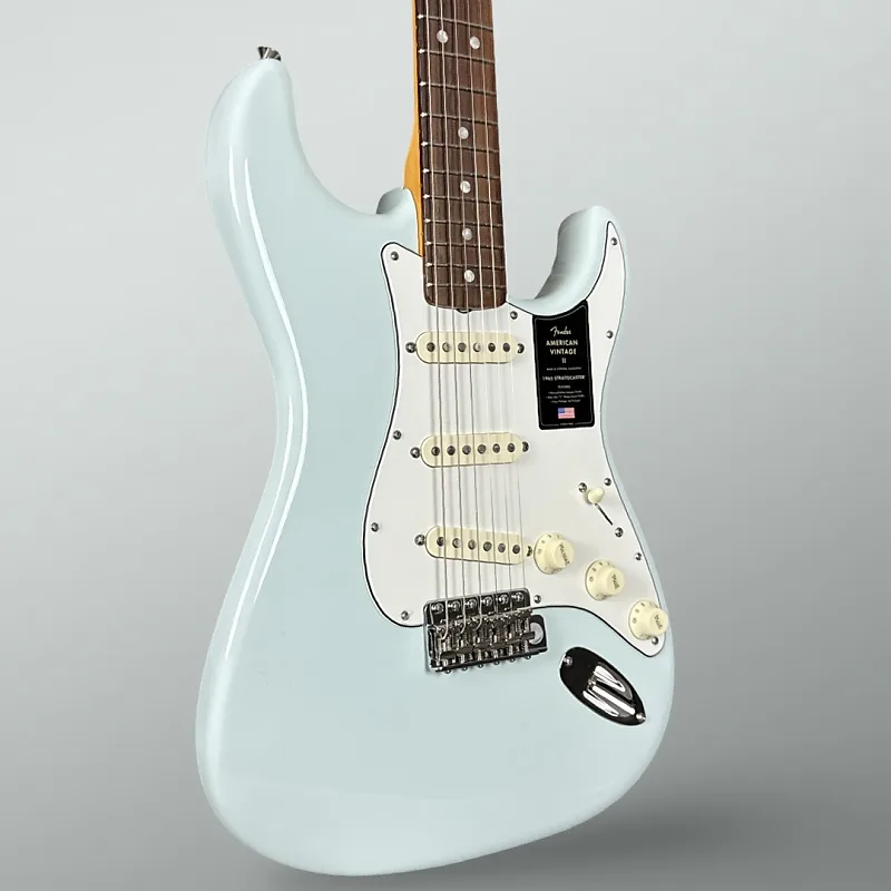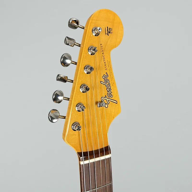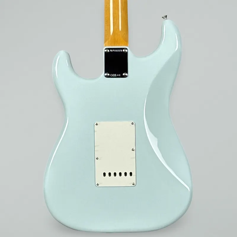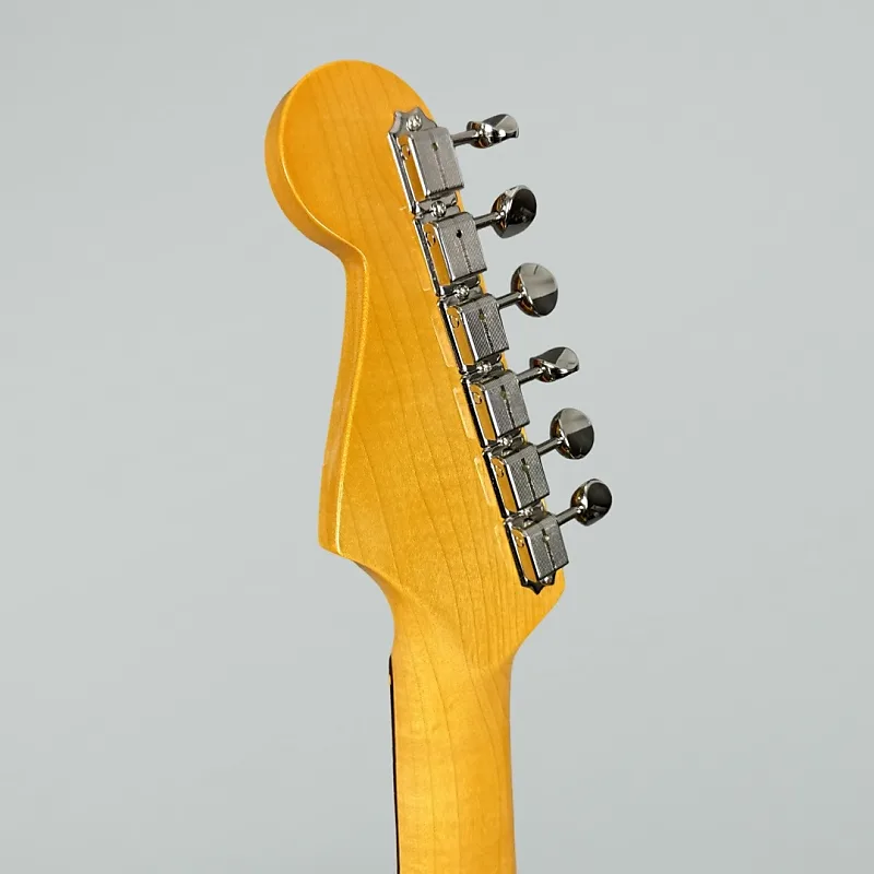 С удобным профилем грифа «C» середины 60-х, круглым ламинированным грифом из розового дерева и тем отличительным трио одиночных звукоснимателей с серым основанием, эта гитара создана как для охотников за тоном, так и для поклонников винтажа. Крупные перламутровые точки, 11-отверстная белая накладка и логотип периода переходного времени завершают эстетику - каждая деталь находится там, где должна быть.