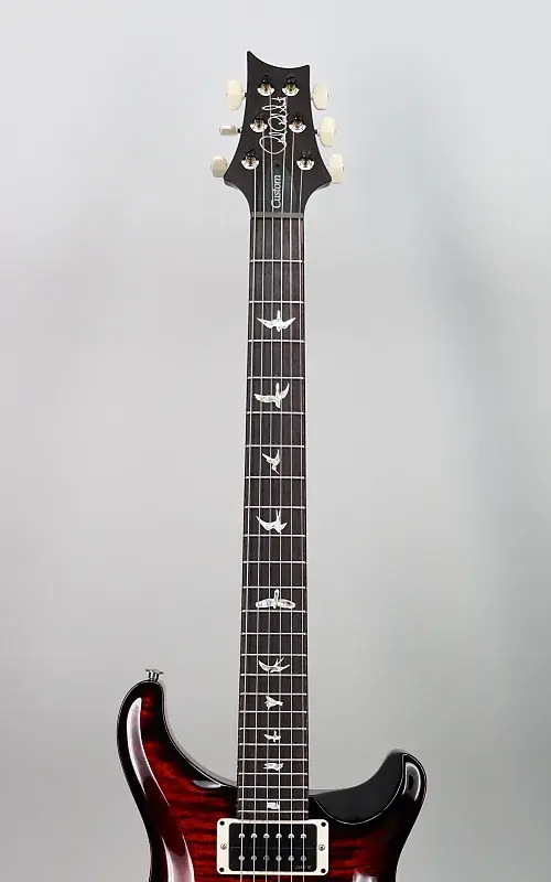 Технические характеристики: Корпус из красного дерева; верхняя дека из ольхи с фигурной текстурой; цельная шея из красного дерева (тонкий узор); гриф из палисандра с 24 ладами; мензура 25"; ширина порожка 1-11/16"; накладки в виде птиц; никелированная фурнитура; запатентованный мост PRS Gen III с тремоло; колки PRS Phase III с блокировкой. Высокоглянцевый никелевый Fire Smokeburst. Жесткий кейс.