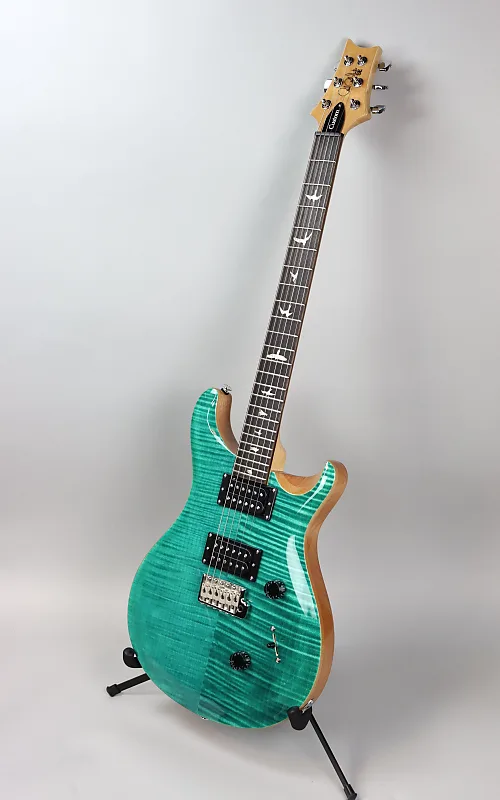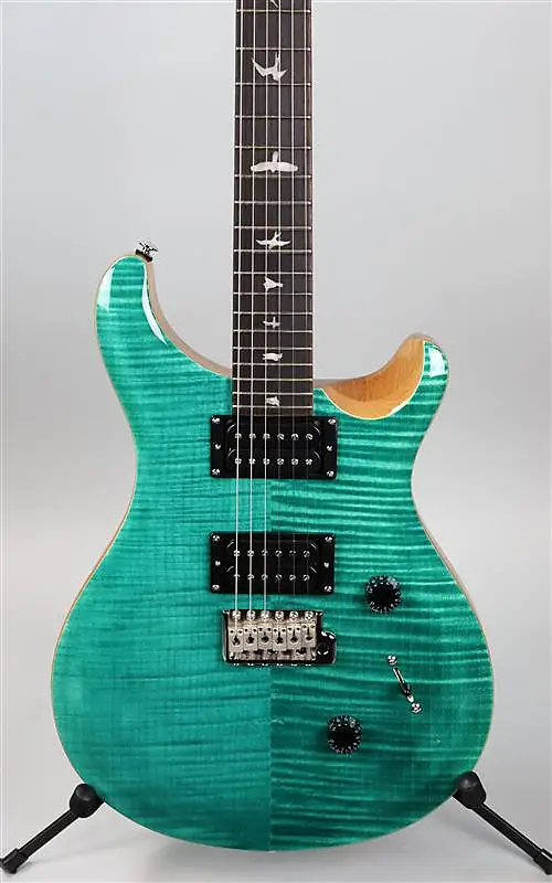 Технические характеристики: Корпус из красного дерева; скос из клена с шпоновой накладкой из клена с рисунком флейм; гриф из клена (широкий тонкий); накладка грифа из палисандра на 24 лада; масштаб 25 дюймов; никелированная фурнитура; тремоло PRS; пташина инкрустация. Отделка «Бирюзовая». Чехол PRS в комплекте.