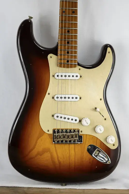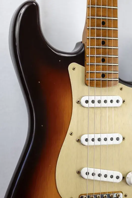 Fender Custom Shop Limited54 Roasted Stratocaster Journeyman Chocolate 2 Tone Sunburst 1954, корпус с вырезом под струны, нитро-лак, гриф стиля 57 V-образной формы - четверть-распиленный обожженный клен, HARDWARE 54, звукосниматели STRAT REL - бридж, средний и нижний, 5-позиционный переключатель, фирменный твидовый футляр