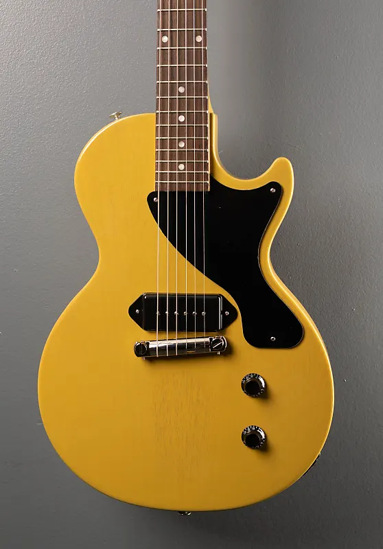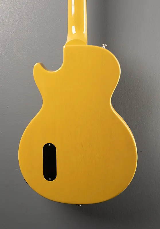 TV Yellow, глянцевое покрытие из нитроцеллюлозного лака, корпус из махагони, гриф из махагони формы 50-х годов, радиус грифа 12” с накладкой из палисандра и акриловыми точечными метками и средние джамбо лады, длина мензуры 24,75", ширина верхнего порожка 1,695", датчик P-90 Dogear у мостика с ручками общей громкости и тона, стабилизирующий хвостовой лепесток Wraparound, тюнеры Gibson vintage deluxe, вес 7,8 фунтов, с жестким футляром