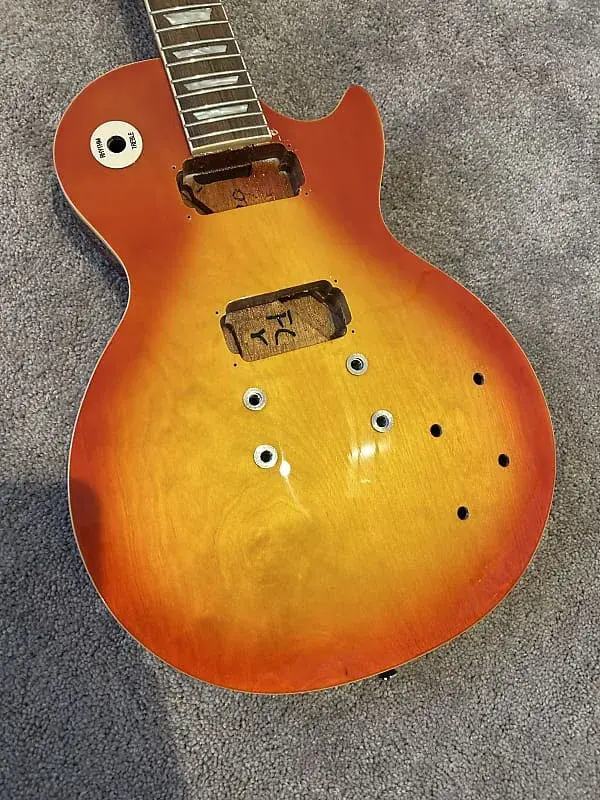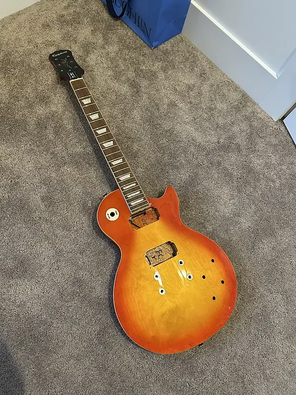Эпифон Les Paul Standard, только корпус и гриф. Проектная гитара. Я планировал сделать красный дизайн в виде мишени на голом дереве, как у Закка Уайлдса. Или вы можете добавить третий звукосниматель, как у Эйса Фрейли. Продается в таком виде, очень хорошая. Без фурнитуры. Думаю, я купил ее в Stratosphere. Стиль 60-х. Думаю, она из середины 2000-х.