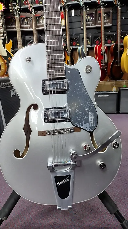 Электромеханическая гитара G5420T Electromatic Classic Hollow Body Single-Cut с Bigsby имеет корпус из ламинированного клена с винтажными контурами и утонченными арками, а также полностью новой конструкцией распорных блоков для уменьшения нежелательных обратных связей. Благодаря увеличенной жесткости и контакту между верхней и задней частью корпуса новая конструкция распорных блоков также обеспечивает более быстрый отклик звучания с большей фокусировкой, резкостью и увеличенной сустейном. В сочетании с новыми звукоснимателями FT-5E Filter’Tron голос этой полой модели взрывается мощным, полным звучанием, классическим звонким тембром, улучшенной выразительностью, ясностью и определением нот.