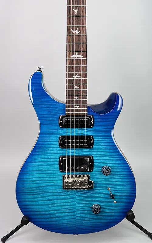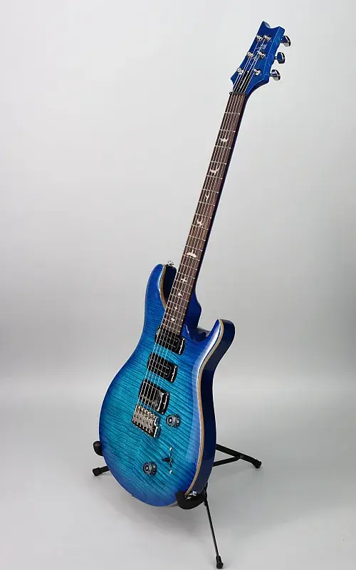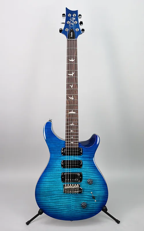 Характеристики: Кленовая дека с фигурным кленовым шпоном; задняя часть из красного дерева; гриф из клена с профилем Wide Thin; накладка грифа из розового дерева с Радиус 10 дюймов и инкрустация в виде птиц; мензура 25 дюймов; 22 лада; синтетический порожек PRS; ширина порожка 1-11/16 дюймов; фирменный тремоло-бридж PRS; тюнеры разработки PRS; металлическая фурнитура; фирменный логотип на головке грифа «SE». Глянцевая отделка Lake Blue. Чехол PRS для переноски в комплекте.