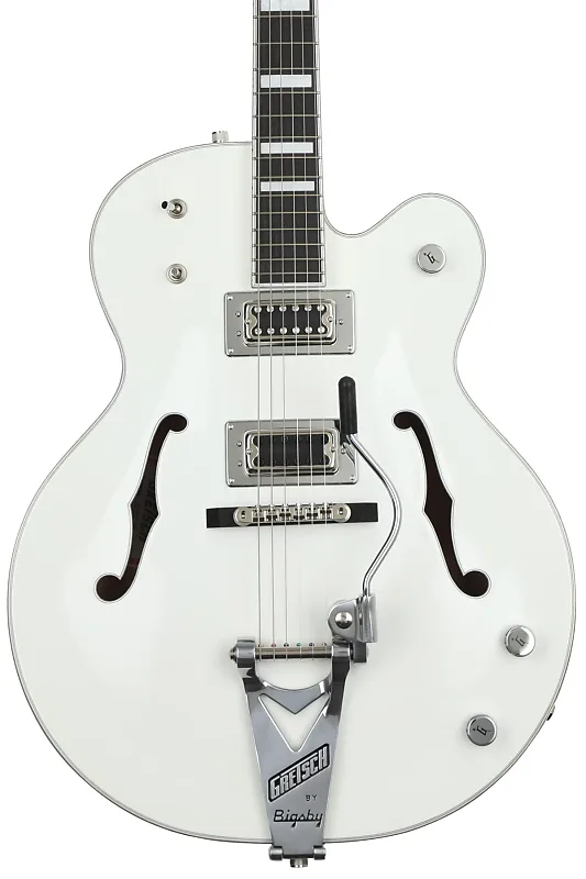 Электрогитара Hollowbody с верхней дека и корпусом из ламинированного клена, 3-частная шея из клена, накладка грифа из эбена и хамбакеры Gretsch Filter'Tron - белого цвета.