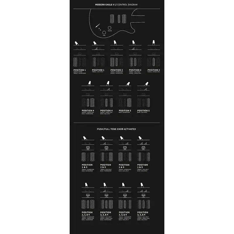 Универсальная конфигурация звукоснимателей: В основе впечатляющей универсальности Modern Eagle V лежат два TCI-звукоснимателя в позициях грифа и бриджа, каждый из которых состоит из двух настоящих синглов. В сочетании с сингловым NS-01 в средней позиции и управляемыми с помощью 5-позиционного переключателя и двух мини-переключателей для разделения катушек, эта гитара легко переходит от искристых сингловых тонов к насыщенному звучанию хамбакеров, предлагая широкий спектр тональных возможностей для любого музыкального стиля.
