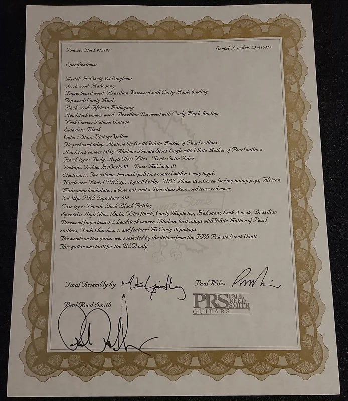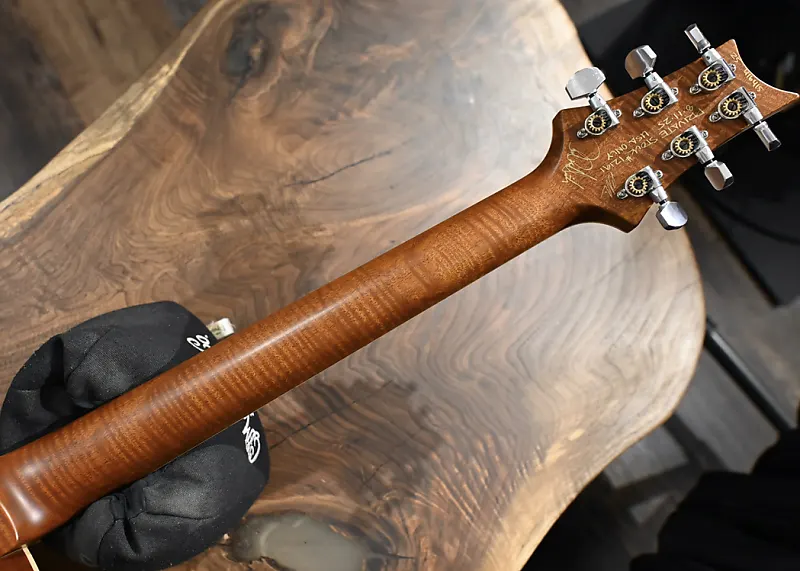 - Фурнитура: Никелевый PRS 2-частный мост stoptail, колки PRS Phase III с блокировкой, задние пластины из африканского махагони, кость для верхнего порожка, накладка на анкерный стержень из бразильского розового дерева