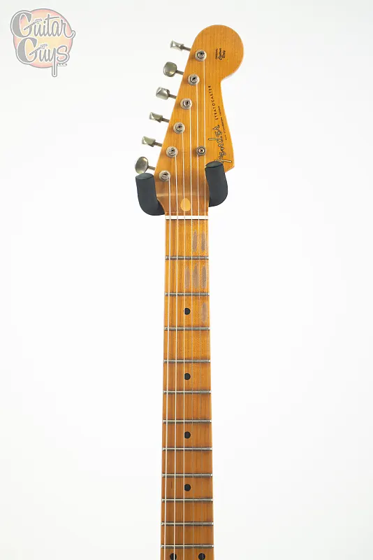 Гриф из цельной жареной резаной кленовой доски выполнен с особым профилем Soft “V” к 70-летию, основанным на потрясающем грифе Strat июля 1954 года, а накладка с радиусом 9,5” оснащена 21 узким высоким ладом (6105) и костью шириной 1,625” у порожка. Три вручную намотанных звукоснимателя ’54 Strat Custom Shop передают классическое звучание Strat с чистыми, колоколообразными верхними частотами через винтажную проводку '54 Strat с конденсаторами из вощеной бумаги и пятирежимным переключателем.