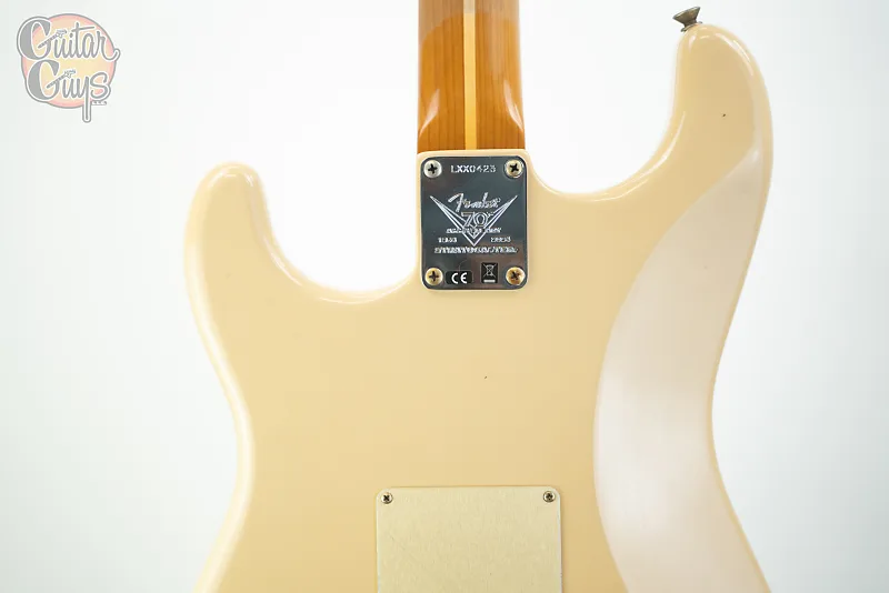 В целом это характерное сочетание эстетики 1950-х годов с другими премиальными особенностями, включая восьмидырочную золотую анодированную накладку, белые крышки и регуляторы звукоснимателей в стиле 1954 года из АБС, тремоло-блок Custom Shop vintage synchronized, колки в винтажном стиле, дисковый держатель струн, специальную накладку на гриф в честь 70-летия Stratocaster, роскошный чехол с вышивкой, ремень и сертификат подлинности.