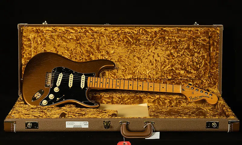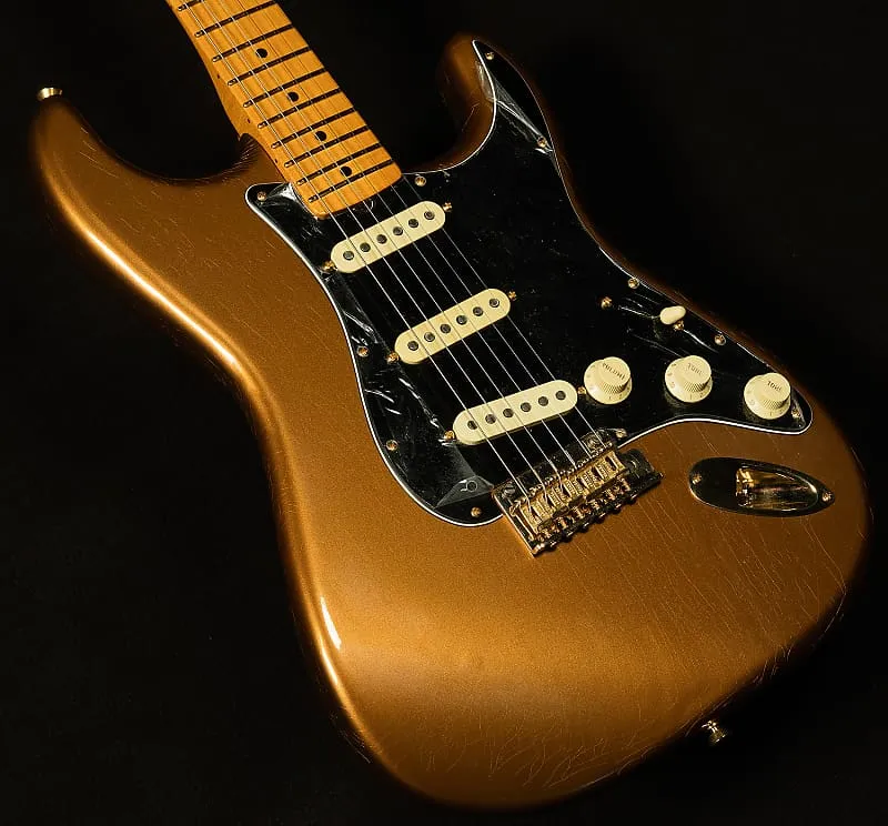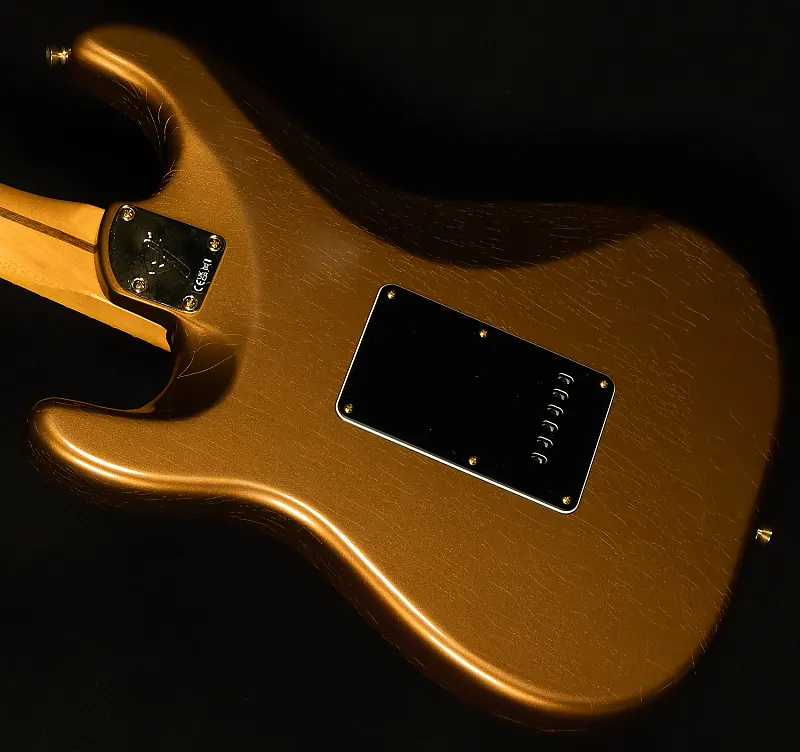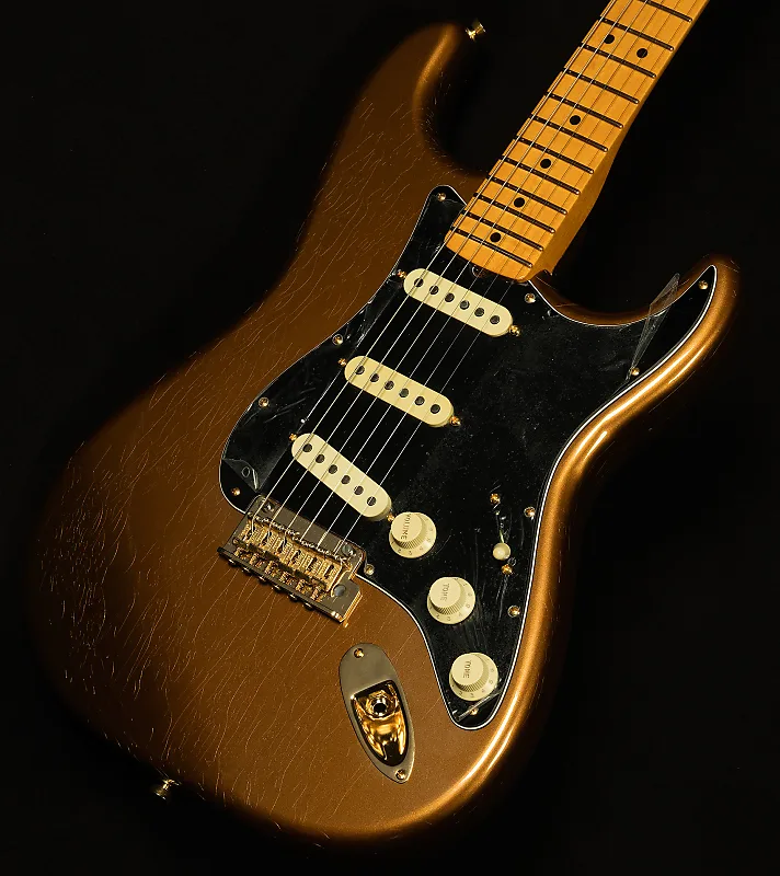 Ограниченная серия Bruno Mars Stratocaster изготовлена из резонансного ясеня со скульптурными контурами корпуса American Ultra для превосходного комфорта и беспрецедентного доступа к верхним регистрам грифа. Покрытие нитроцеллюлозным лаком Mars Mocha Heirloom создает изящную состаренную эстетику, обеспечивая при этом максимальный резонанс и чистый тон. Кленовый гриф с увеличенным радиусом 9,5-12 дюймов и лады из нержавеющей стали обеспечивают шелковистое, полированное ощущение плавного изгиба и легкость игры. Изготовленные на заказ звукосниматели Bruno Mars Stratocaster точно настроены для достижения любимых тембр Бруно для классического блеска Strat и поющих лид-звуков. 2-точечные синхронизированные тремоло и блокирующие тюнеры Deluxe обеспечивают повышенную стабильность настройки с современным удобством, в то время как полный комплект фурнитуры Heirloom Aged Gold придает этой высокопроизводительной гитаре обтекаемый вид и ощущение хорошо использованного, ценимого инструмента. Также в комплект включены фирменный ремень с леопардовым принтом и дополнительная трехслойная мятно-зеленая накладка на гриф.