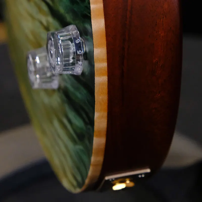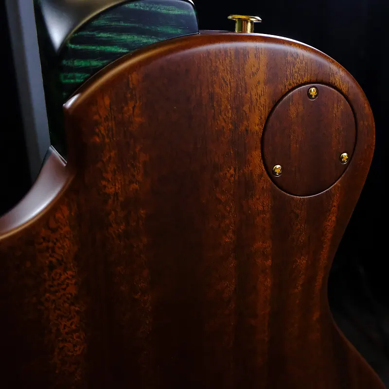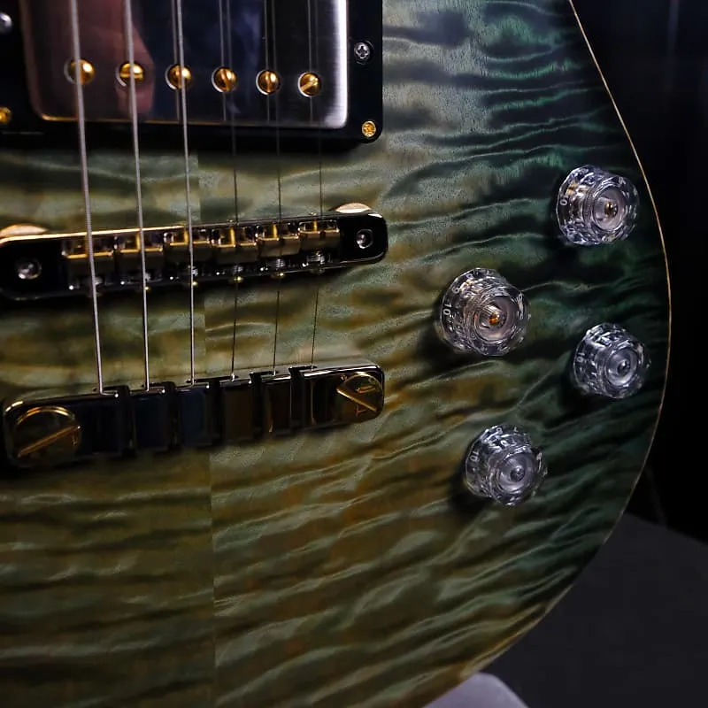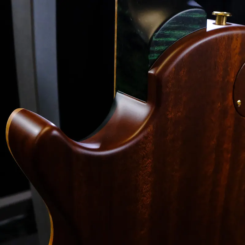 В сердце этого инструмента находится потрясающая верхняя дека из кленового «квилтед» (Quilted Maple), тщательно подобранная за выразительный рисунок и тональные качества. Корпус изготовлен из африканского махагона, обеспечивая тепло и сустейн, в то время как шея и гриф из кудрявого клена (Curly Maple) предоставляют гладкое и четкое ощущение при игре. Накладка на головку грифа, также из кудрявого клена, украшена великолепным инкрустированным золотым орлом Private Stock из перламутра с центром Paua и окантовкой, добавляющими дополнительный штрих роскоши.