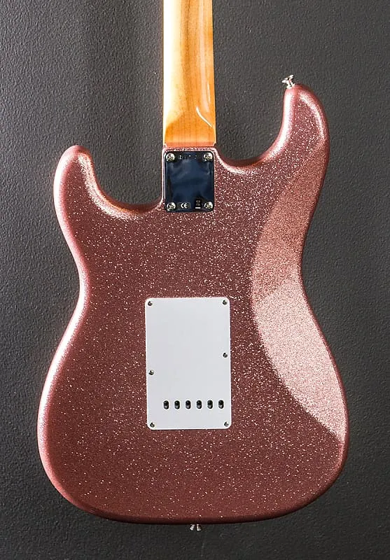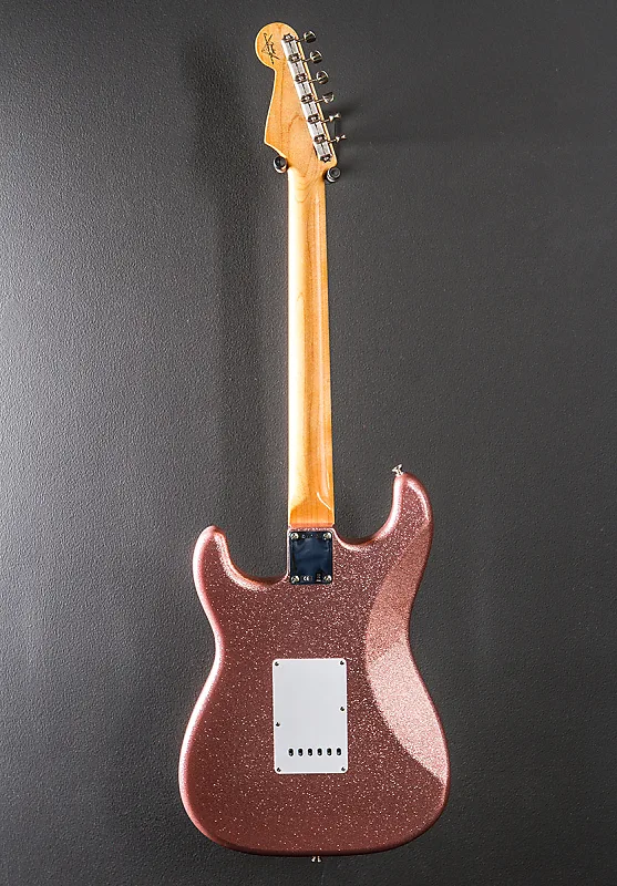 Шампань блестящая, корпус из ольхи, гриф овальной формы C середины 60-х годов из клена с радиусом 9,5" и накладкой грифа из розового дерева класса AAA с медиум-джамбо ладами, длина мензуры 25,5", ширина верхнего капа 1 5/8", ручной намотки звукосниматели Strat '60/'63 Relic с RW/RP средним звукоснимателем, 5-позиционный переключатель с проводкой vintage mod #1, толщина грифа 0,80" у первого лада и 0,94" у 12-го лада, вес 8,2 фунта, в жестком футляре
