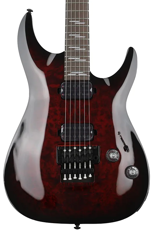 Электрогитара с цельным корпусом, верхняя дека из тополя, корпус из красного дерева, гриф из клена, грифовая накладка из розового дерева, тремоло Floyd Rose и 2 хамбакер-пикапа - цвет Black Cherry Burst.