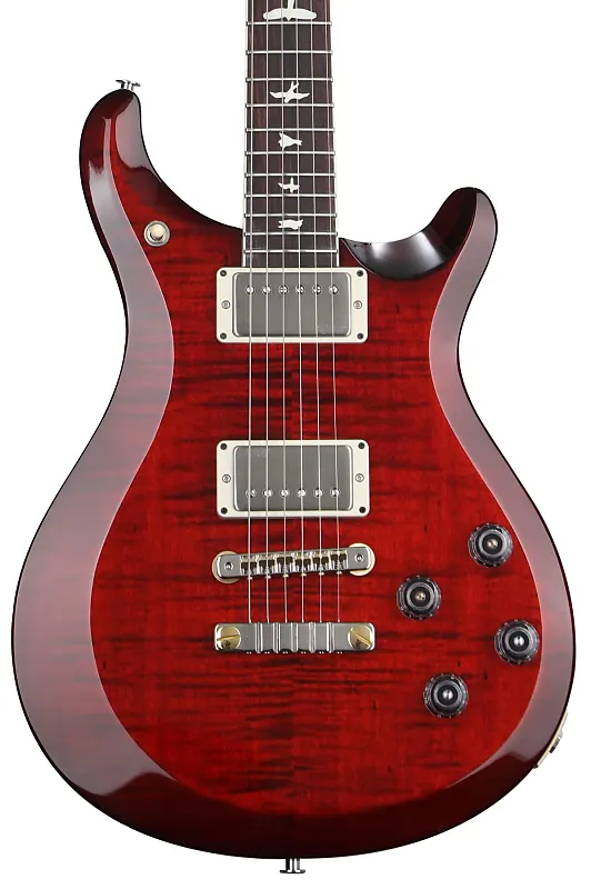 Электрогитара с массивным корпусом из красного дерева, верхней декой из клена, грифом из красного дерева, грифовой накладкой из палисандра и двумя хамбакерными звукоснимателями - огненно-красный градиент.