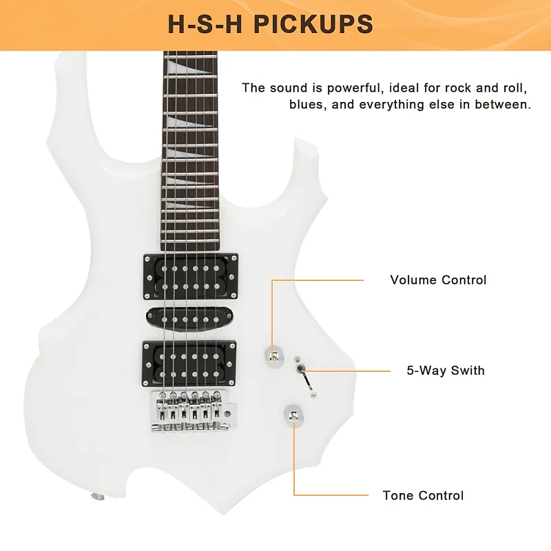 Уникальный дизайн электрогитары в форме пламени привлекает внимание и добавляет индивидуальность вашему исполнению. Узоры на корпусе с 24 ладовыми ладами также создают эффектный вид, выделяя вашу гитару среди других.